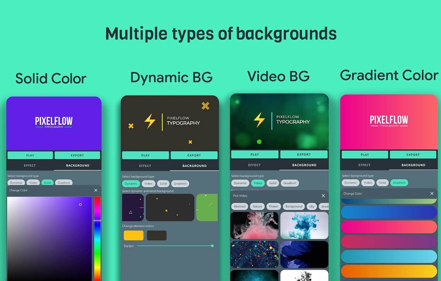 Приложение PixelFlow включает в себя коллекцию настраиваемых текстовых и фоновых анимационных шаблонов. Просто вписывайте свой текст выбирайте анимацию и сохраняйте получившийся результат.