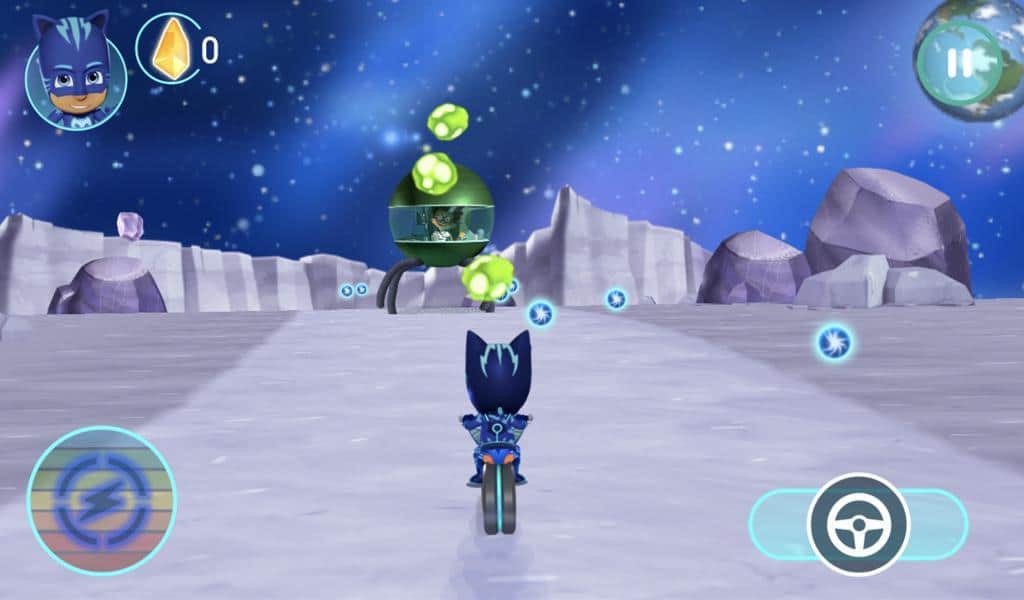 PJ Masks: Racing Heroes – гонки на андроид, где вы будете гонять по Луне. Выбирайте себе гонщика из предложенных персонажей таких как Кэтбоем, Алетт и Гекко. Ночные злодеи Лунная девочка и Ромео решили заполучить все лунные кристаллы которые позволят увеличить их силы. Вы должны им помешать, отправляйтесь в путешествие и управляйте ровером гоняя по Луне. Остерегайтесь многочисленных преград и опасностей подстерегающих вас на каждом шагу и соберите как можно больше кристаллов.