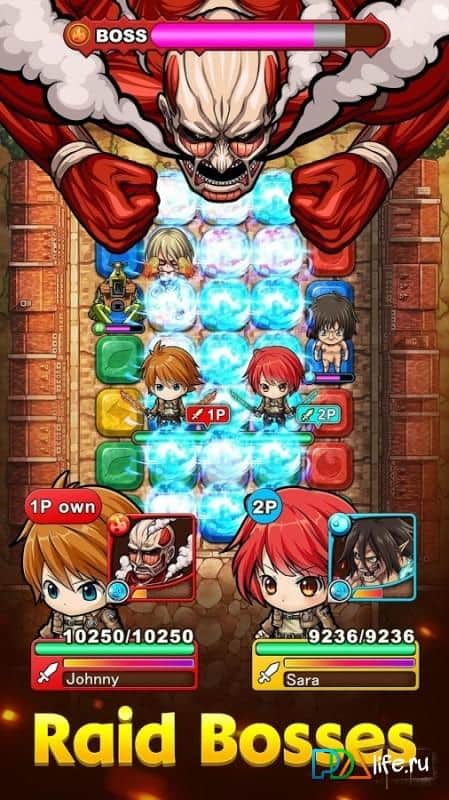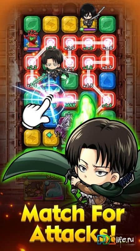 PMQ: Attack on Titan (Collab) – RPG на андроид, где вы будете помогать главным героям аниме спасать свой город от атак титанов. Эта игра перенесет вас в далекое будущее, где на города людей стали нападать огромные титаны и поедать местных жителей. В этой игре вы будете выступать в качестве главных героев спасительных отрядов, которым выпала непростая учесть уничтожить всех врагов. Перемещайте по различным платформа различного цвета и соединяйте их в непрерывные линии, нанося тем самым атаки врагам. Чем больше атак вы произведете тем большая вероятного того что вы одолеете самого главного титана. Создавайте для своих героев новое современное оружие и побеждайте с помощью него мощных противников.