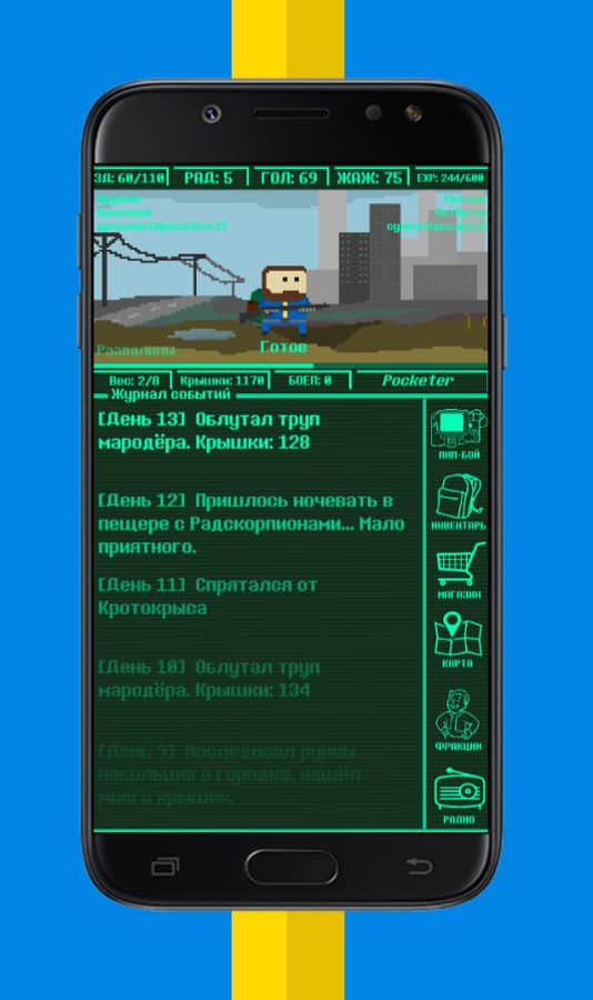 Pocket Fallout – захватывающая игра на андроид, где вы будете выживать в ужасном разрушенном мире. В этой игре ваш герой будет перемещаться, и исследовать мир вокруг себя, а вы будете следить за всем происходящим на страничках «журнала событий». Прокачивайте своего героя по ходу игры и наделяйте его мощным оружием для борьбы с врагами или незаметной экипировкой. Разрабатывайте свою тактику ведения игры и добивайтесь отличных результатов. Присоединяйтесь к одной из фракций обитающих в этом мире и получайте долгожданные бонусы. Скупайте и собирайте расходники и продавайте их гораздо дороже и выгодней для вас. Слушайте радио и продержитесь как можно дольше в этой игре.