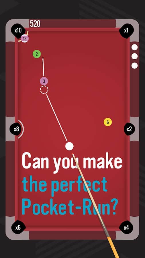 Pocket Run Pool – классический бильярд на андроид, в который вы сможете играть против компьютера или игроков со всего мира. Играйте в свою любимую игру в любое свободное время и тренируйте свои навыки и умения. С помощью кия закатывайте шары в лузы и набирайте достаточное количество очков. За каждый не удачный ход вы будете терять свои жизни, так что постарайтесь закончить партию до того момента пока у вас будут ходы. Соревнуйтесь против игроков со всего мира и добивайтесь отличных результатов поднимаясь как можно выше в таблице лидеров. Игра порадует игроков простым и понятным управлением, приятной графикой и занимательным геймплеем.