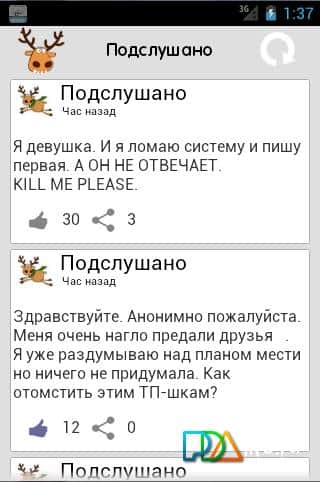 Подслушано для андроид от разработчика Саша Ди. Если вы любите совать свой нос не в свое дело, читать чужие секреты и тайные откровения, то это приложение для вас. "Подслушано" создано специально для публичной страницы ВКонтакте, читайте и наслаждайтесь невероятными, смешными и неординарными историями!