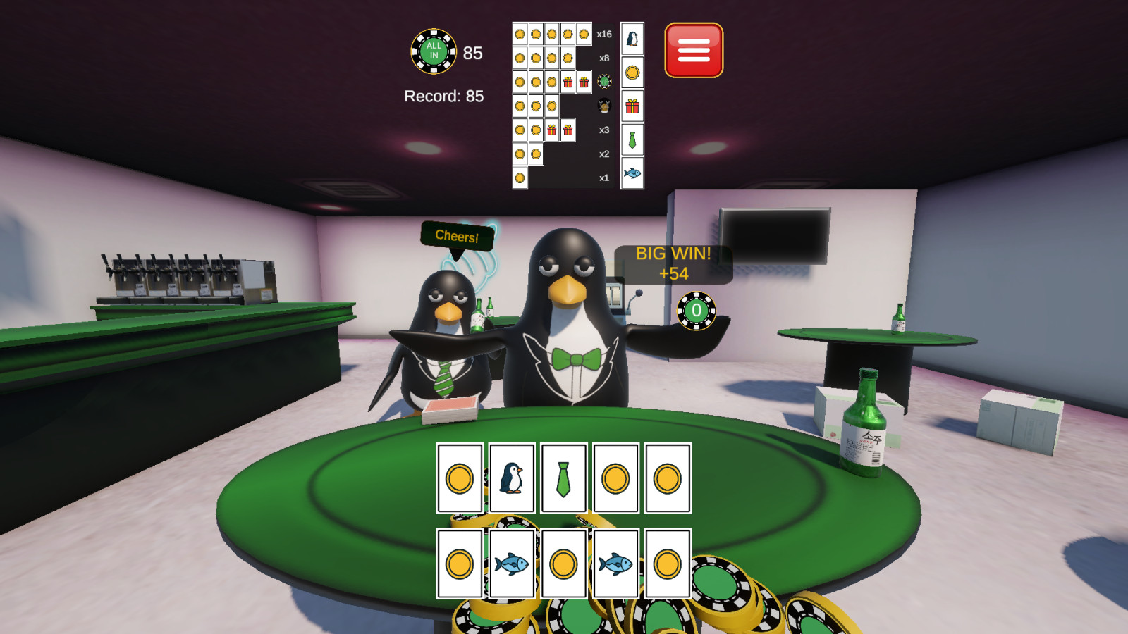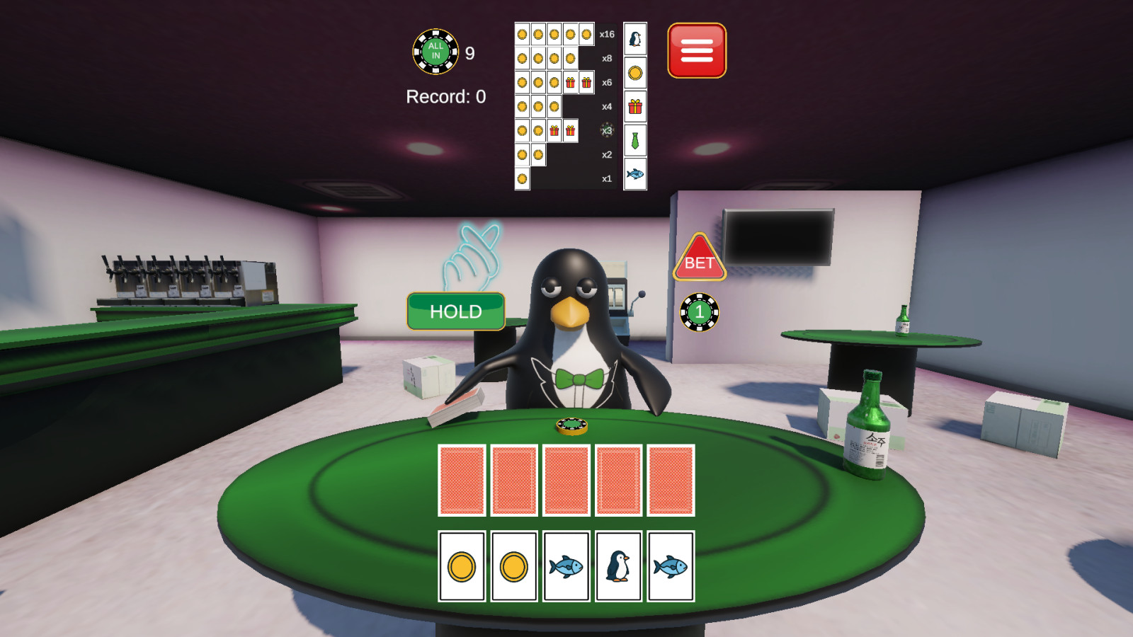 Poker Penguin - Добро пожаловать в ледяной бар, где царит азарт и веселье! В игре тебя ждёт харизматичный пингвин-дилер с непроницаемым лицом и острым умом. Сможешь ли ты обыграть его и не потерять всё? Правила просты — собери комбинацию лучше, чем у соперника, и забери победу. Атмосфера бара, весёлые персонажи и лёгкий юмор создают идеальный коктейль для отдыха. Это не просто покер — это ледяная битва умов и удачи!
