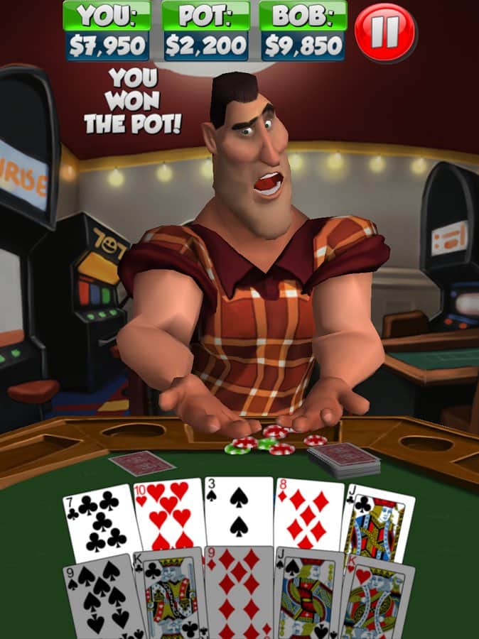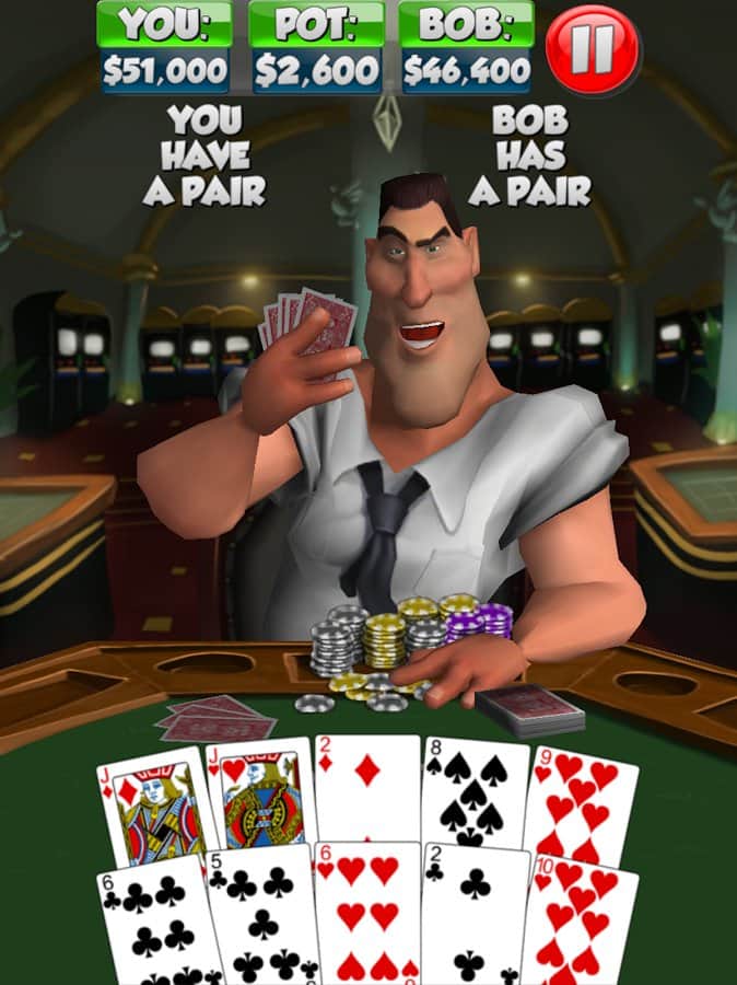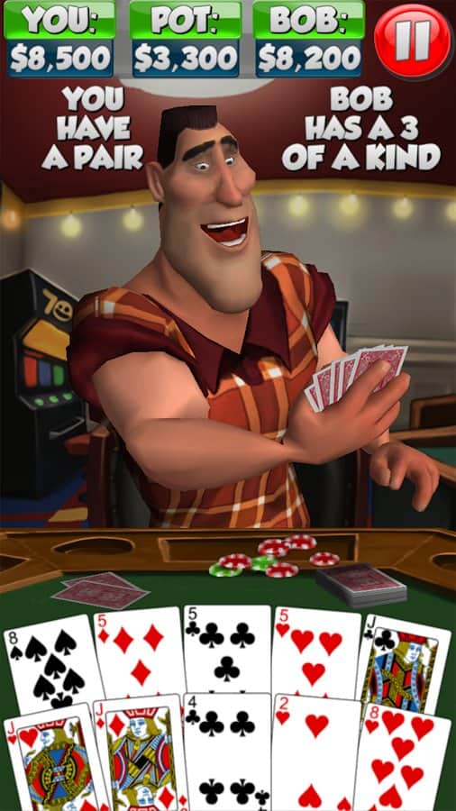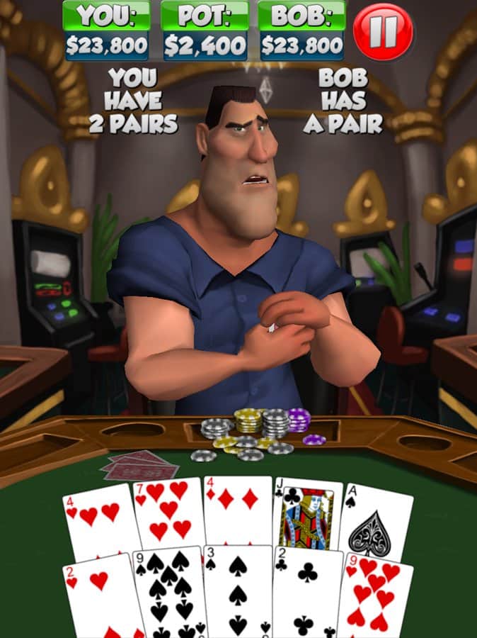 Poker With Bob – отличная карточная игра на андроид, где вы будете играть в покер с анимированным игроком Бобом. Играйте с Бобом в режиме реального времени и делайте свои ставки. Ваш соперник будет раздавать карты и вы с помощью его эмоций и поведения сможете понять какими картами он владеет. Наблюдайте за реакцией Боба, который будет насмехаться над вами когда вы будете проигрывать, а также грустить и расстраиваться когда он сам будет проигрывать. В игре представлено пять различных уровней сложности, обучающий учебник и возможность заработать много денег делая высоки ставки в игре.