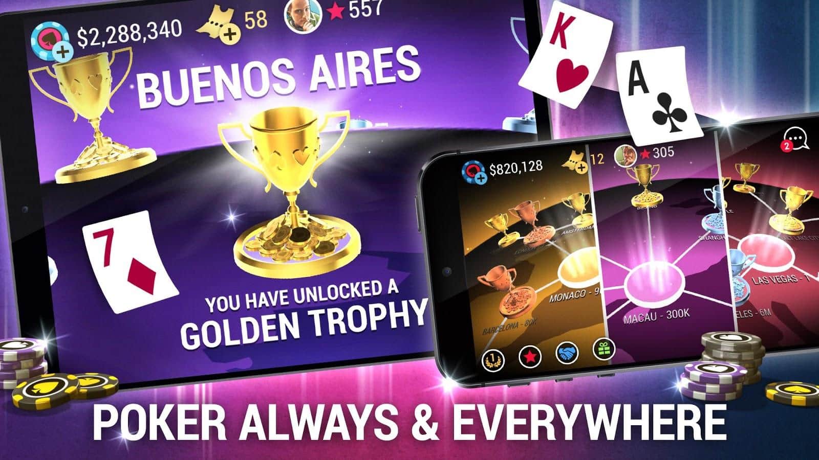 Poker World - Offline Texas Holdem – карточная игра на андроид, где вы будете играть в покер в разных городах мира. Начните свой первый покерный турнир в Соединенных Штатах Америки и выигрывайте его, повышайте свою репутацию и отправляйтесь в путешествие по всему миру. Вы сможете участвовать в разнообразных и многочисленных турнирах проходящих по всему миру и получать лучшие спонсорские сделки и покупать различные предметы. Покажите всем игрокам свой статус и докажите что вы лучший игрок в покер на планете. Не удивляйтесь, если вам будут бросать вызов лучшие игроки со всего мира, участвуйте с ними в турнирах и занимайте лидирующие места.