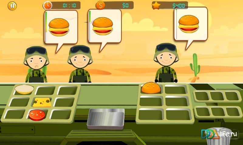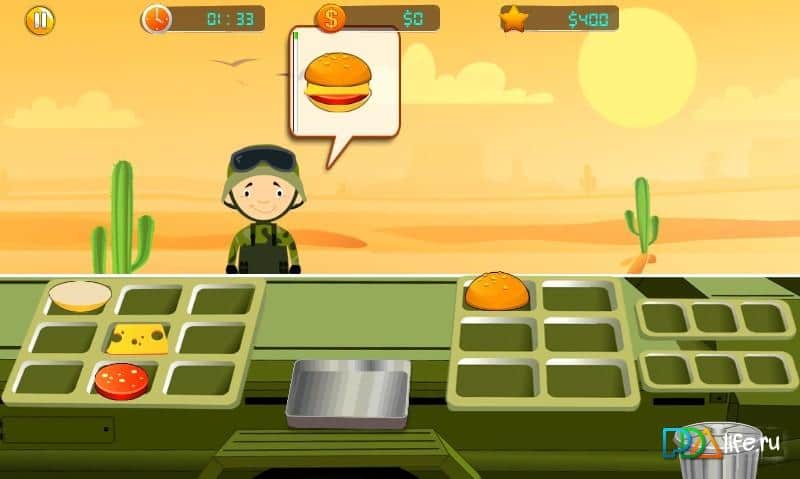 Полевая кухня – интересная игра на андроид, где вы будете управлять полевой кухней в военной части. В этой игре вашей главной задачей будет накормить всех солдат и офицеров в полевых условиях. Раскочегаривайте полевую кухню и готовьте вкусные булочки и котлеты для гамбургеров, а также не забывайте заваривать чай и крепкий кофе. Как только у вас будет все готово то созывайте солдат, выдавая им комплексный обед при этом действуйте как можно быстрее чтобы не создавать очередь. Готовьте порции на всех солдат и не заставляйте их ждать. Служба должна быть службой, а обед по расписанию.