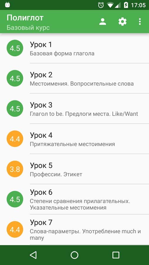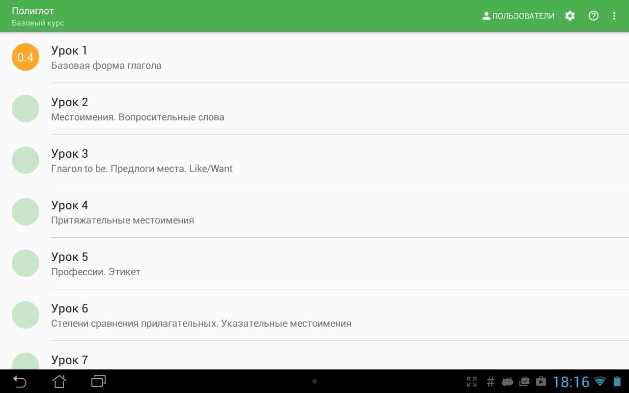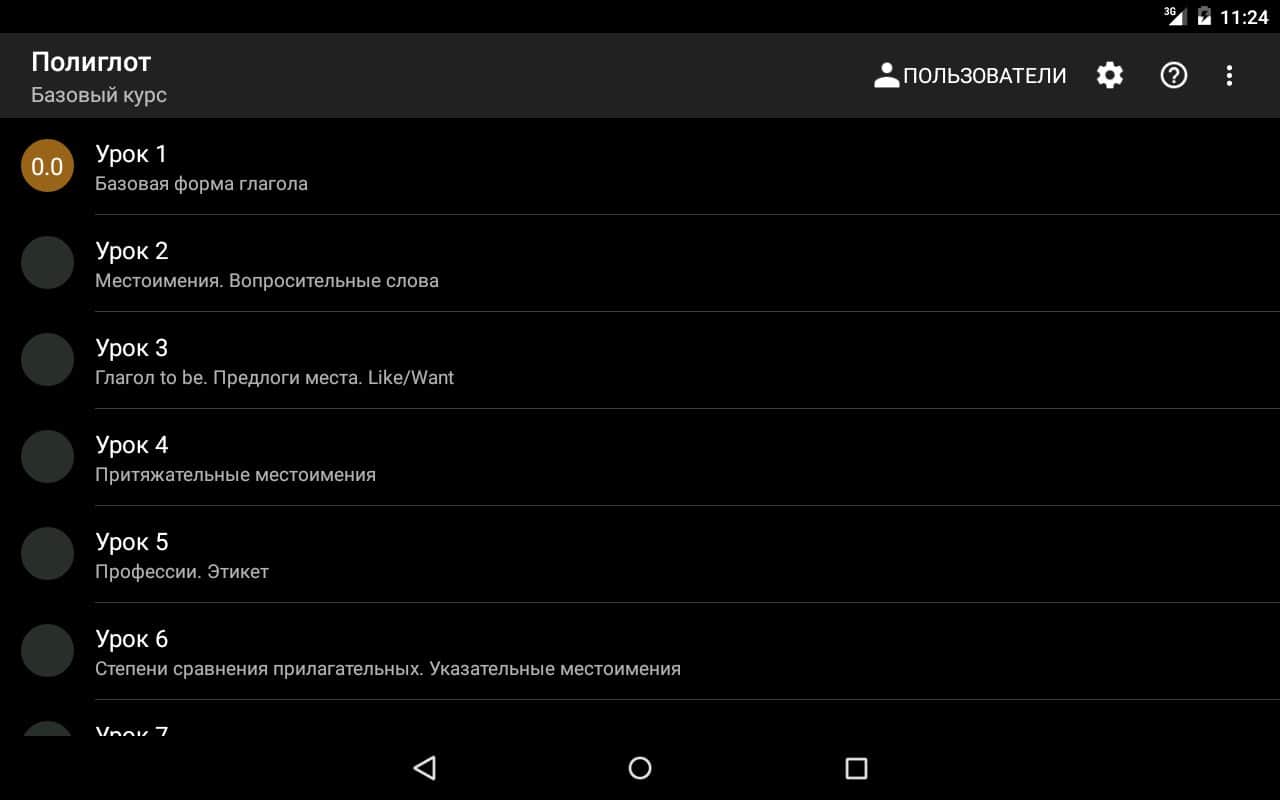 Полиглот – отличное приложение для изучения анлгийского языка на андроид, созданное по урокам Дмитрия Петрова "Выучи английский за 16 часов". По мнению Дмитрия, любой прошедший полный курс уроков (16 уроков) сможет разговаривать на английском языке. Не упускайте возможность для самообучения и саморазвития.