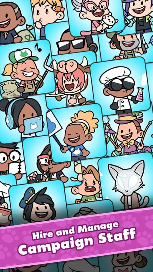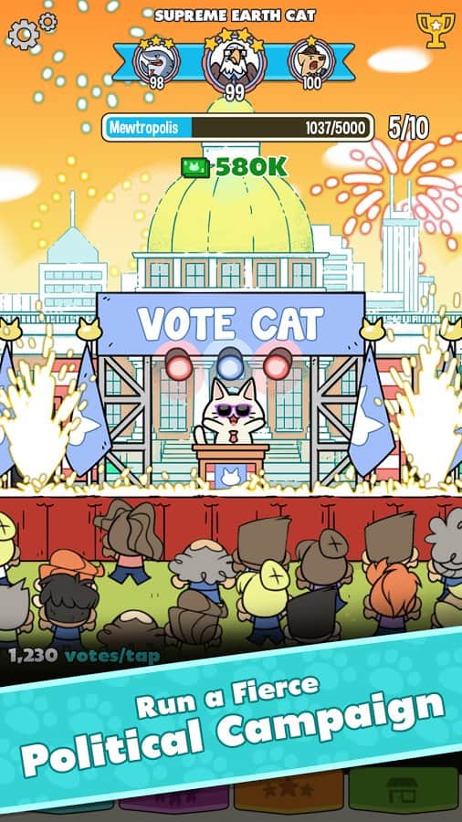 PolitiCats: Free Clicker Game - Почувствуйте себя в шкуре весьма необычного политика. Теперь не нужно смотреть на лица всех этих современных политиков, играйте котиком! Это вполне себе простой кликер, но с одной интересной особенностью. Вам предстоит не только улучшать, изменять и продвигать своего котика, но и сражаться на выборах в суровых дебатах против других политиков. Переодически в качестве босса уровня, вам нужно будет набрать больше процентов голосов чем у вашего оппонента. Игра простая но очень увлекательная.