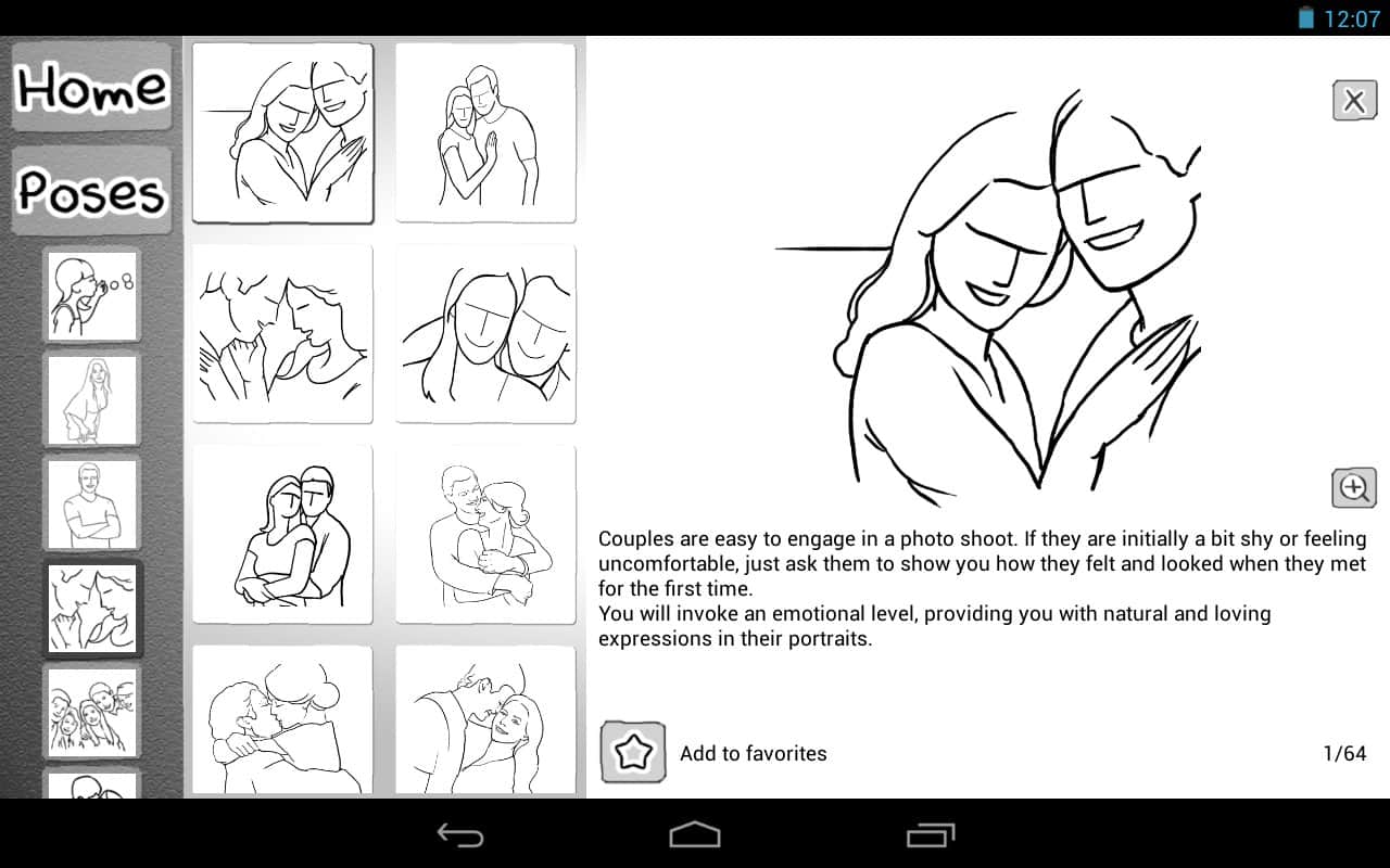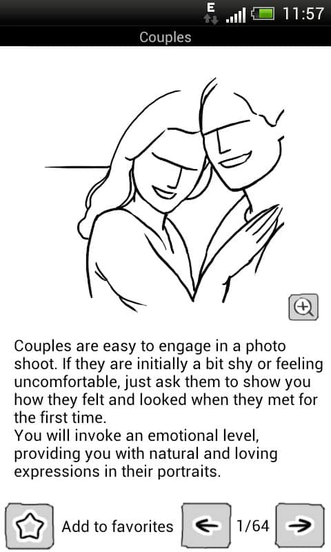 Posing App – фотография стала неотъемлемой частью нашей жизни. Все мы любим фотографироваться, а потом хвастаться друзьям и подругам отличными снимками. Однако любительские фото редко бывают удачными и из 100 снимков, только 2-3 в лучшем случае могут оказаться по-настоящему хорошими. Данное приложение поможет вам в выборе удачных ракурсов и поз как для модели, так и для фотографа. Posing App содержит категории (Дети, Пары, Портреты, Женщины, Мужчины, Группы и Свадьбы), а так же темы для фотосессии («Основы фотографии людей», «Выражения лица», «Позиционирование головы, рук и ног», «Подчеркивание разных частей тела», «Советы фотографам по аппаратуре и композиции») – все это можно добавить в закладки для быстрого доступа. Отличных снимков!