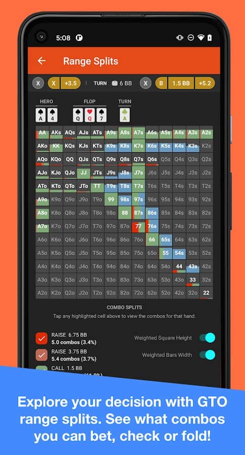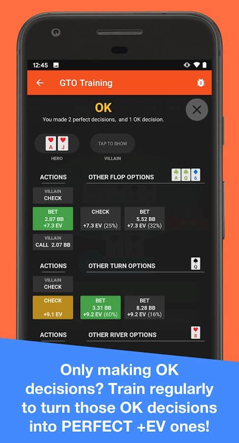 Postflop+ Приложение GTO Poker Trainer для Холдема - Если вы давно хотели научиться играть в покер, но не могли найти для этого достойного учителя, то вы сможете это сделать при помощи приложения Postflop+. Позволит освоить не только теорию, но и практику в этой популярной игре. Используйте самые передовые и эффективные методики обучения, выбирайте действенные инструменты. Развивая свои навыки, вы сможете проходить из уровня в уровень, одерживать победу, разрабатывать собственную стратегию. Учитесь делать оптимальную ставку и регулировать её частоту, не ошибаться в своих решениях, исследовать различные варианты и линии, становиться лидером и занимать первые позиции в таблице. Соревнуйтесь со своими друзьями в увлекательной игре и оттачивайте свои навыки.