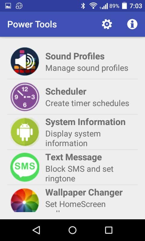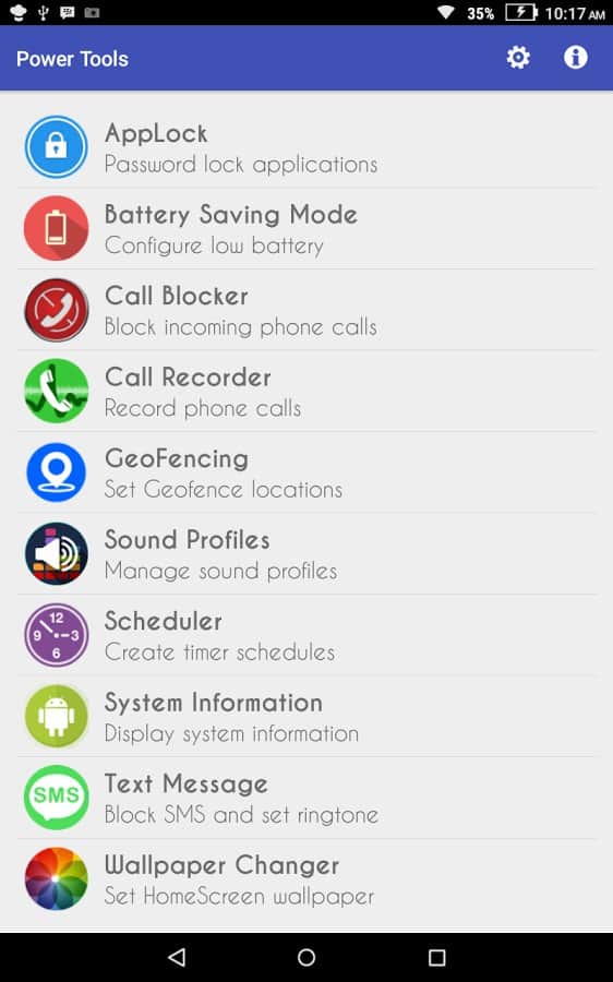 Power Tools - Это уникальный "Швейцарский нож" для вашего устройства. Здесь есть все что нужно, можно даже сказать, что это приложение заменяет стандартные настройки вашего устройства. При этом расширяя их, и делая более точными. Вы можете полностью настроить функции ваших приложений, когда и где им включатся, или же какие из них выключить вовсе. Можете подключить функцию определения вашего местоположения, и сделать так, что бы перемещаясь, ваш телефон менял точки доступа Wi-fi. Настройки звука, смена обоев, и даже встроенный виджет, для управления состоянием вашей батареи. Здесь есть всё! Больше не нужно хранить на телефоне десяток программ, хватит всего одной.