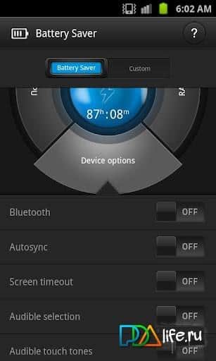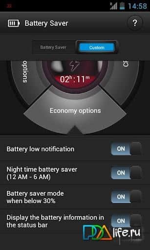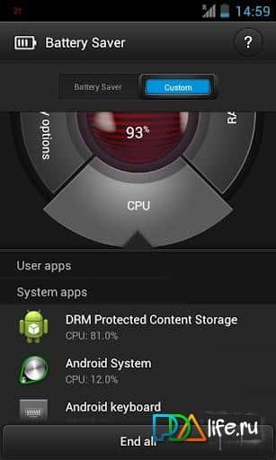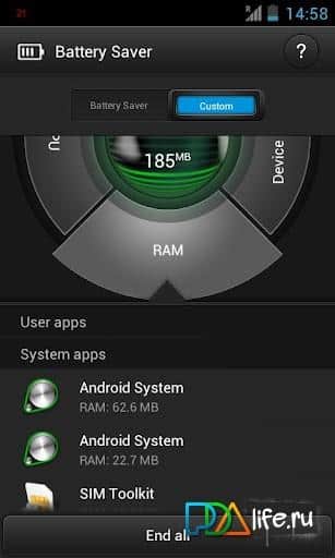 В Battery Saver можно быстро настроить основные опции энергосбережения, увидеть какие приложения более всего потребляют ресурсы памяти и процессора, убрать из памяти ненужные приложения.