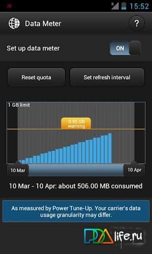 Функция Data Meter незаменима для пользователей, которые используют лимитированный тарифный план оператора связи. Если вы некоторое количество 3G трафика в месяц получаете по льготной цене, а за превышение взымается почти вся зарплата, то установите в программе лимит загруженных данных за месяц и приложение вас заранее предупредит о превышении.