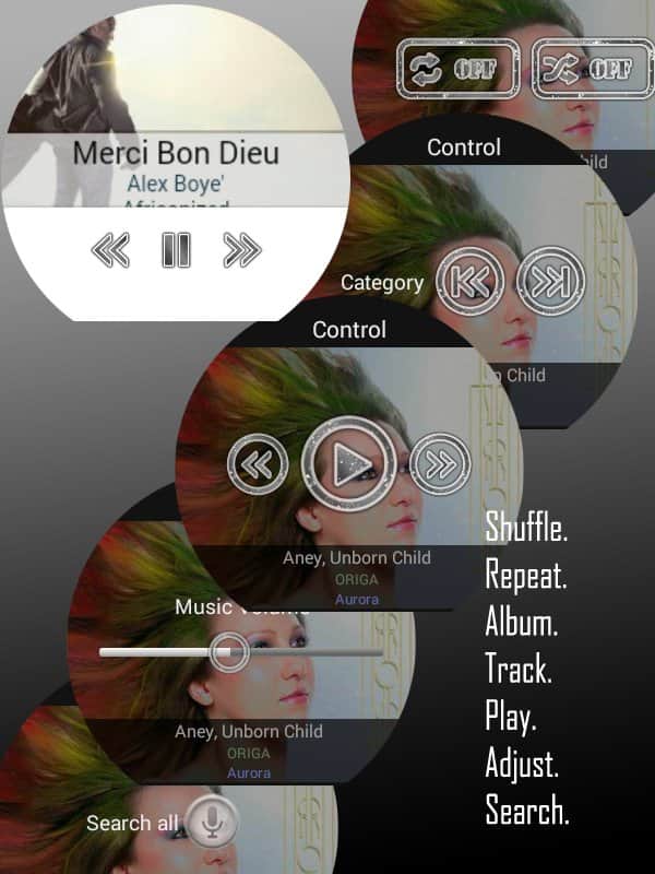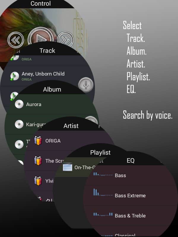 Популярный плеер Poweramp обзавелся своеобразным пультом управления в виде смарт-часов на Android Wear. С часов можно регулировать звук, переключать треки, выбирать нужные дорожки, исполнителей, альбомы или плейлисты. Здесь же доступен эквалайзер: можно переключать готовые пресеты но не регулировать их, что, впрочем, для часов и так неплохо. Кроме того, можно включить режим повтора или случайного воспроизведения — и все это не доставая смартфон из кармана. Приложение хорошо смотрится как на круглых, так и на квадратных экранах.