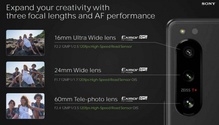 Тыловая камера тройная, все модули предлагают одинаковое разрешение, 12 Мп. Основной дополняют телефото и широкоугольный, два последних дополнены оптической стабилизацией. Селфи-камера на 12 Мп располагается в верхней рамке. Как и ранее, Sony не использует вырезы в экране.