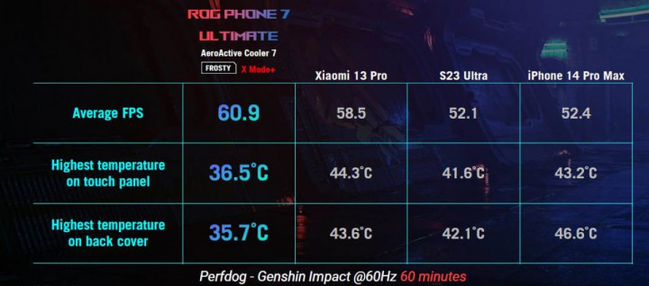 За производительность отвечает топовый Snapdragon 8 Gen 2. Для его охлаждения в серьезных игровых баталиях используется система охлаждения GameCool7 со слоем нитрида бора и двойными графитовыми пластинами общей площадью 16 000 мм², их дополняет испарительная камера с быстрым циклом. Оперативной памяти может быть 12 или 16 ГБ, постоянной — 256 или 512 ГБ. В поддерживаемых играх ROG Phone 7 позволит включать трассировку лучей, а для повышения игровой производительности предусмотрен режим X Mode.