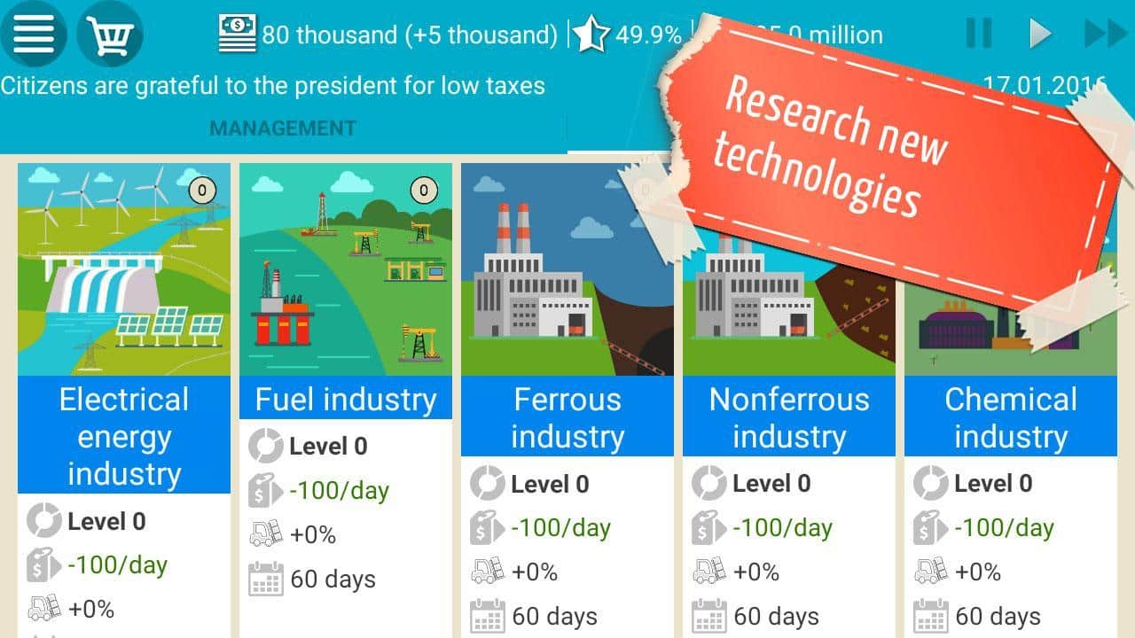President Simulator – отличный симулятор на андроид, где вы сможете побывать в роли президента. Если вы думаете что жизнь станет лучше если вы станете президентом то эта игра создана для вас, попробуйте себя в этой роли и оцените всю нагрузку и ответственность, которая ляжет на ваши плечи. Выбирайте президентом какого государства вы будете, всего в игре представлено более 163 стран. Вашей задачей в этой игре будет поднять экономику своей страны, следить за восстаниями, увеличивать военную мощь, находить шпионов и предотвращать эпидемии. Стройте заводы, занимайтесь торговлей с другими государствами, принимайте на работу опытных политиков и дипломатов и развивайте свое государство. Сделайте свою страну лучше и поднимайте свой рейтинг до невероятных высот.