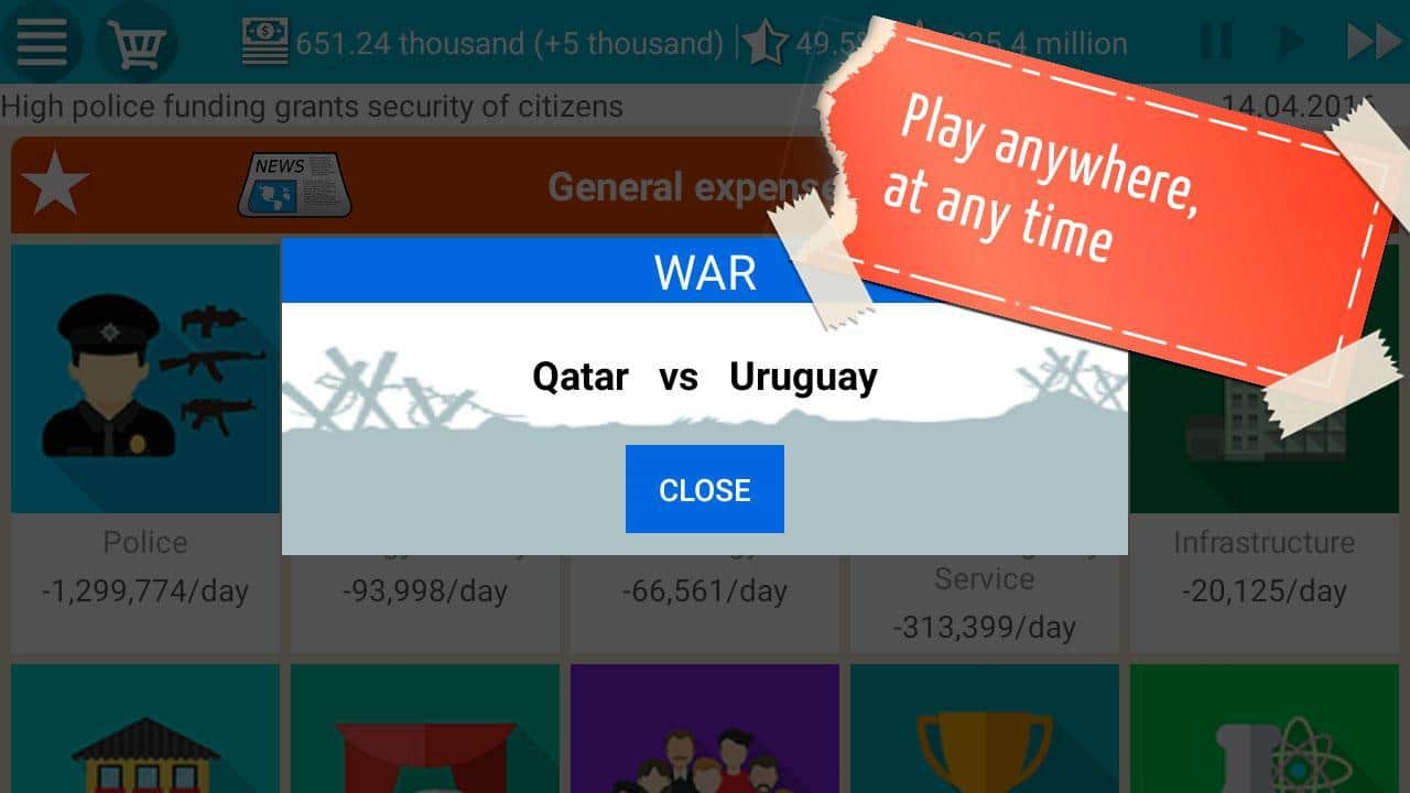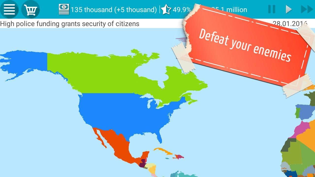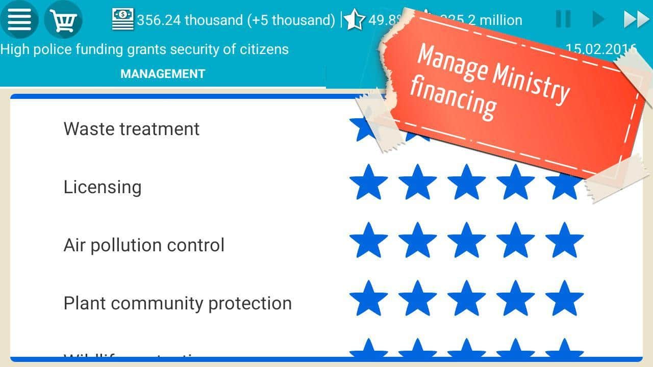 Игра скучная,ну сделали фиговую графику,где реалистичные действия,интересные хотя бы,законы нельзя отменять или добавлять,и всяких штук нету короче скукота,которая в плей маркете ещё продается,я хотел ввести законы на кашу из опилок и переименовать страну в Ебенград