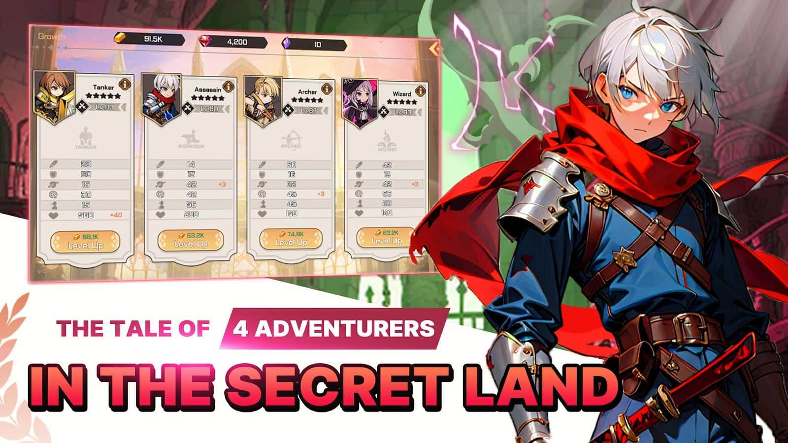 Secret Land Adventure - В далекой, неизведанной области обнаружен новый континент, привлекающий своих искателей приключений с огромными мечтами. Сразу же отправимся в горячую точку этого Нового Мира . Создайте мощную команду из 4 персонажей с разными классами. Приключения станут настоящей вечеринкой! У каждого персонажа есть уникальные навыки, разрушительные на одном ударе. Ваша команда становится невероятно сильной!