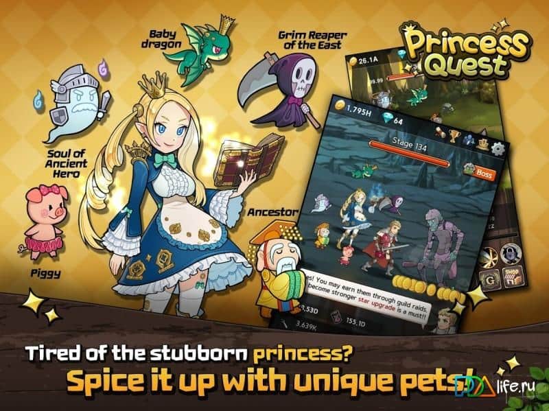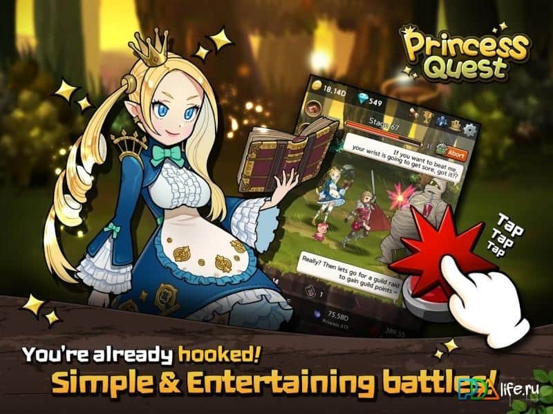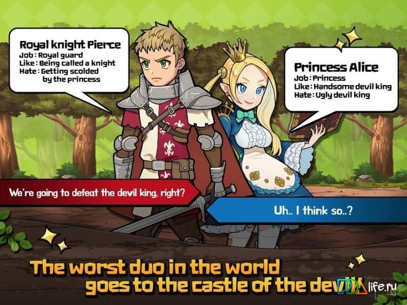 Princess Quest – интересная игра на андроид, где вы будете помогать принцессе Алисе уничтожить короля демонов. Главная героиня этой игры принцесса Алиса была похищенная из своего замка демонами, ей удалось сбежать и теперь ее главной задачей будет уничтожить всех демонов, призвав на помощь союзников. Перемещайтесь по различным локациям игры и уничтожайте всех демонов вставших у вас на пути. Кликайте по экрану своего телефона или планшета как можно чаще и атакуйте врагов. Выполняйте различные задания и миссии, предложенные вам этой игрой и наслаждайтесь приятной атмосферой, многочисленными ужасными монстрами и пополняйте свой отряд верными соратниками.