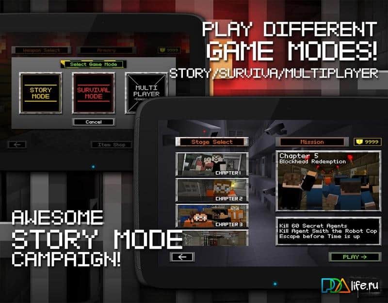 Prison Break Craft 3D - Очередная андроид игра с пиксельной графикой в стиле шуттера. В этот раз вам предстоит сбежать из тюрьмы. Но вас постоянно будут преследовать охранники, против которых вы и будите воевать. На ваш выбор в игре есть множество оружия, среди которых популярные модели автоматов. В игре два режима: выживание и прохождение, в котором вам доступно пять различных уровней.