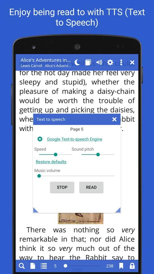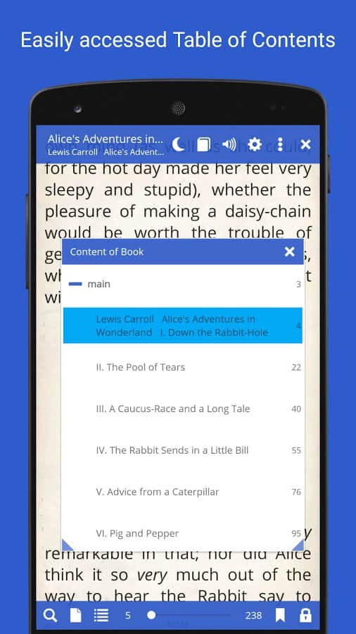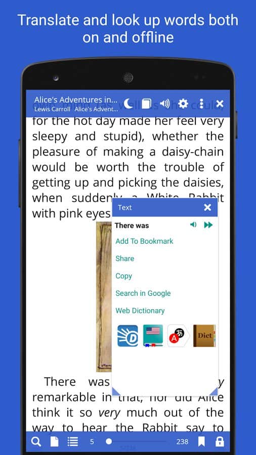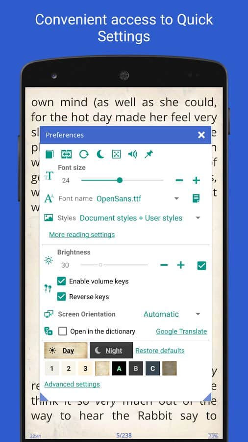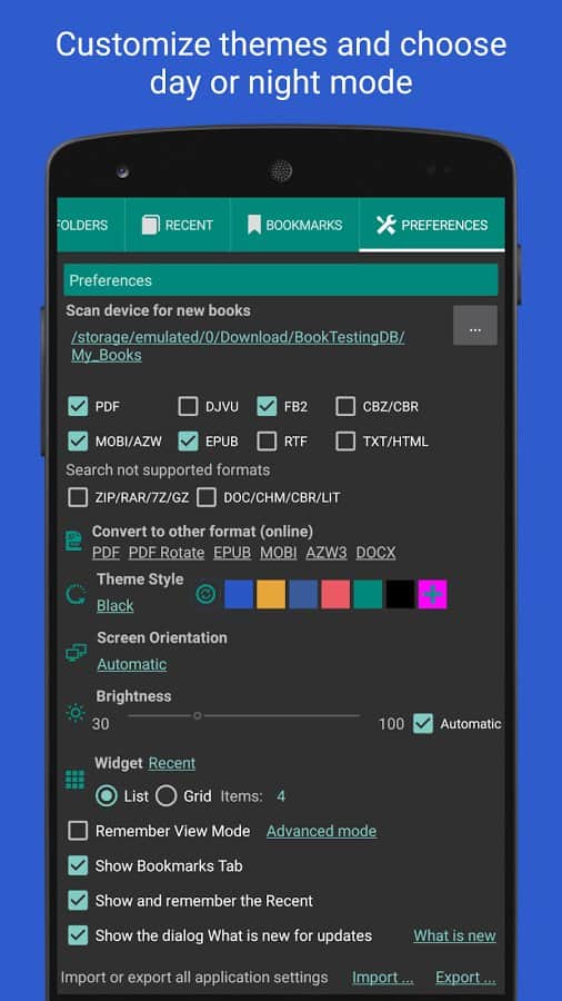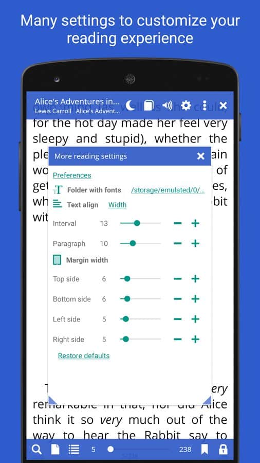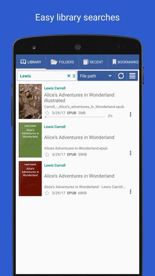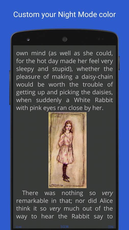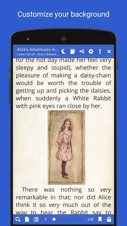 Находит все книги на устройстве и создает из них библиотеку. Можно менять размер обложек книг и отображение. Чтение также удобное, можно настроить шрифт, отступы, ночной режим, свои фоны, чтение голосом, автоматическую прокрутку, заметки, переводчики и словари — в общем все что нужно в одой читалке.