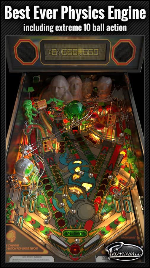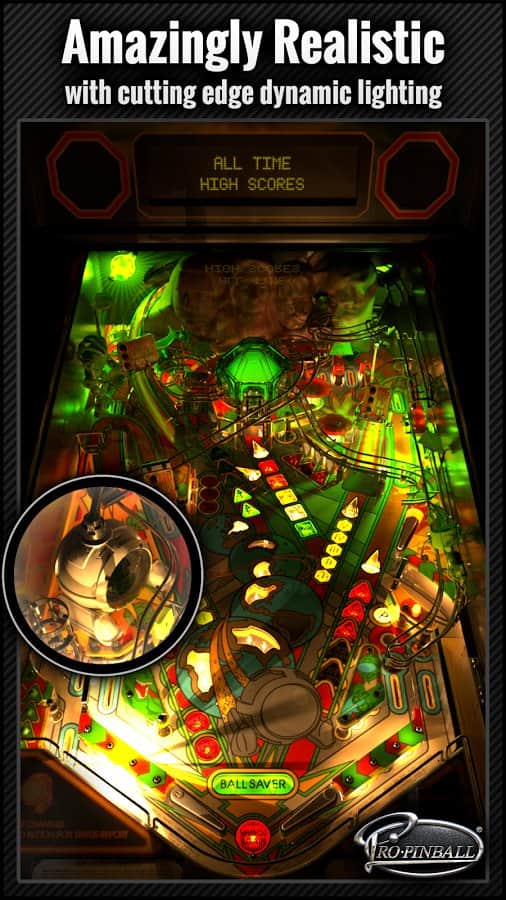 Pro Pinball - Интересный и захватывающий симулятор пинбола с очень качественной физикой и графикой на наши с вами андроид девайсы. К сожалению, в вашем распоряжении будет всего один игровой стол, но с очень большим количеством различных деталей, которые по разному подсвечиваются, в общей картине создавая довольно красивый вид. В игре так же присутствует интересный и не обычный режим "без стекла", в котором вы сможете управлять шариком прикосновением пальца.