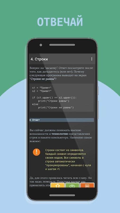 Программирование игр, создание с нуля (Python 3) 2 - Программирование вполне возможно усвоить с полного нуля, хоть ребенку, подростку, или же взрослому человеку! В этом полезном приложении собрана целая подборка необходимой информации, разбросанная по различным категориям и как отличное дополнение — викторина в игровой форме. Кроме того, что вы можете изучать данные для начала работы, у вас есть возможность играть в: угадай слово, пятнашки, сокобан, космические захватчики и другие, у каждой из них есть собственные правила и процесс усвоения информации.