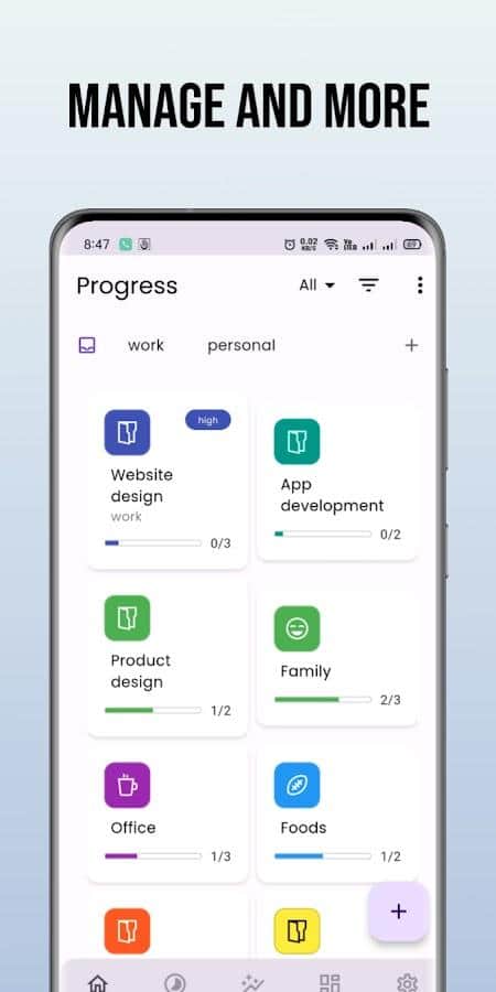 Progress Tracker - приятное и эффективное приложение для отслеживания прогресса в любом деле. Пользователи смогут создавать различные задачи, выделять их среди менее значимых случаев, вносить корректировки, устанавливать важные точки, запускать таймеры, устанавливать сроки выполнения и так далее. Большое разнообразие, удобство управления, видимость, направленность и напоминания создают мотивирующий аспект и помогают не забывать ни о чем. Благодаря этому владелец устройства всегда будет в курсе состояния конкретной задачи.
