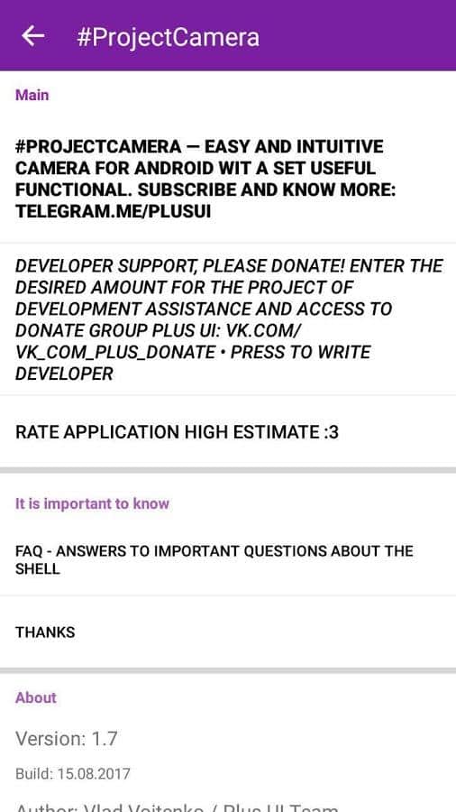 Камера #ProjectCamera - Новый уровень фото в вашем смартфоне. В этом приложении нет ничего лишнего только минимализм и самые удобные и полезные функции. По сути это обычная камера но с расширенными функциями. Так же она делает фото в различных разрешениях и в различном качестве и имеет в себе множество точных настроек, с помощью которых вы сможете улучшить качество фото.