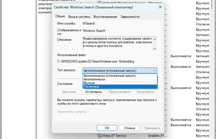 Полный список служб проще всего открыть через Пуск — Поиск — Службы. В открывшемся окне вы выбираете интересующий процесс, вызываете контекстное меню — Свойства и в новом окне в поле Тип запуска выбираем Отключена. Таким образом вы отключите службу полностью.