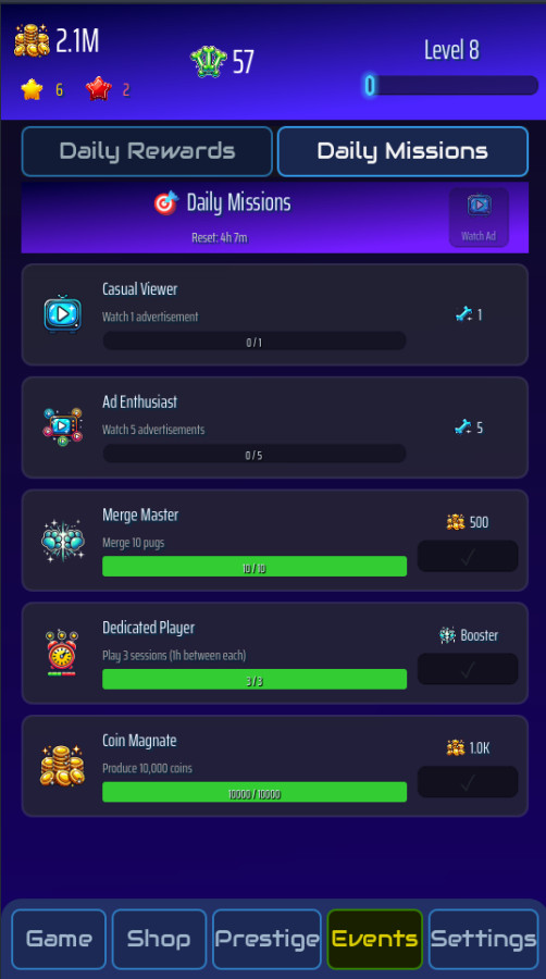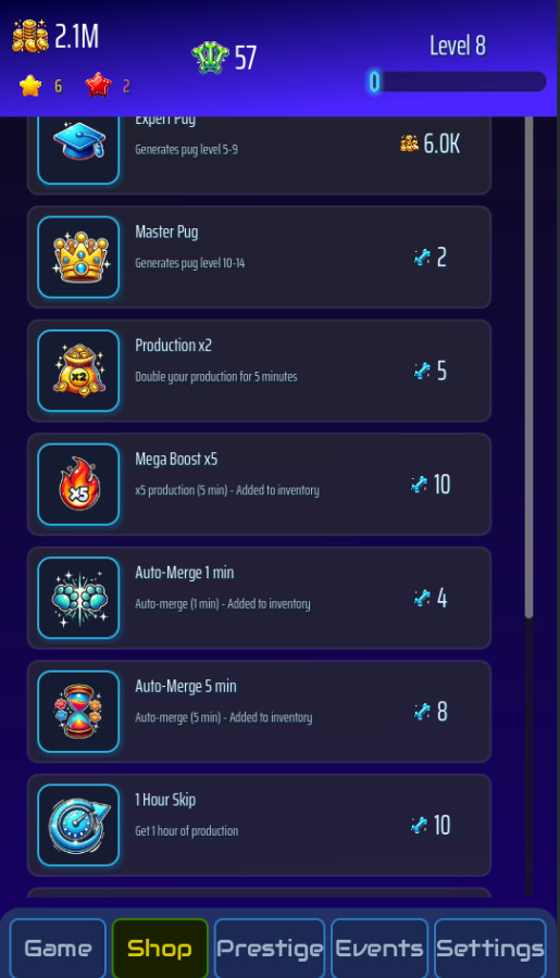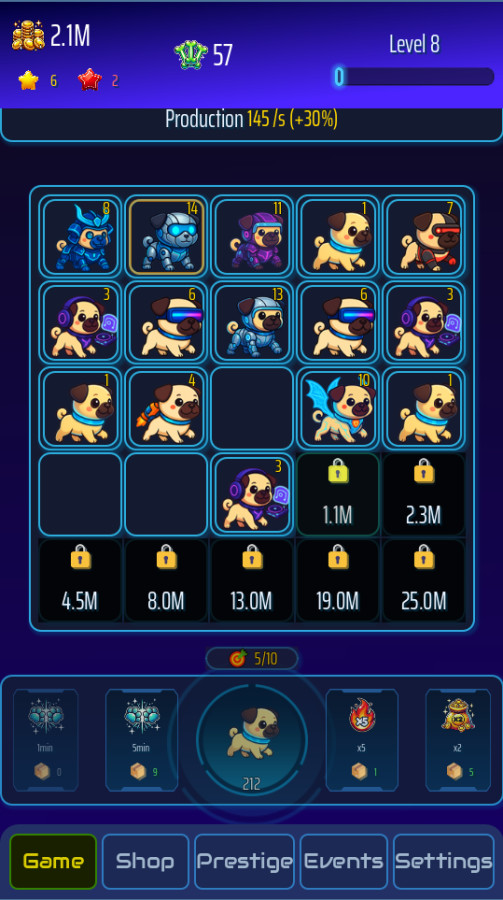 PugRace Evolution — это очаровательная казуальная игра в жанре idle + merge, где вы объединяете милых мопсов и наблюдаете, как они эволюционируют в новых забавных формах. Начав с простого щенка, вы откроете 15 уникальных уровней развития и создадите собственную империю мопсов. Питомцы продолжают зарабатывать монеты даже офлайн, а вас ждут ежедневные задания, награды и престижная система. Развивайте доску, открывайте новые слоты и станьте главным тренером эволюции мопсов!