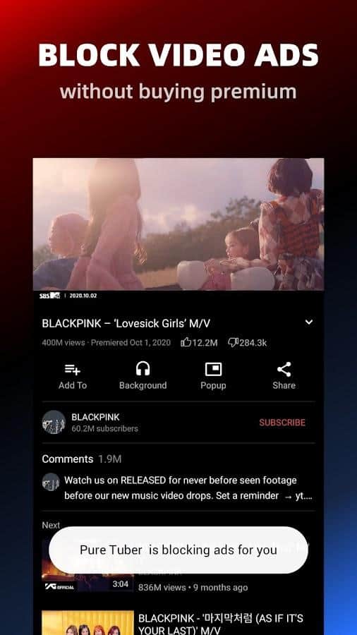 Приложение не понравилось. Рекламы, конечно, нет, но видео даже на 360р постоянно подгружает, невозможно ничего смотреть. При попытке включить функцию "в фоне", которая по идее должна просто воспроизводить звук видео на фоне приложений, появляется окно с видео. Также вы не можете смотреть комментарии. Нужна замена ютубу без рекламы - качайте New Pipe. Рекламы нет так же, как и в pure tuber, доп функции адекватно работают, вечных подгрузок нет и плюсом к этому есть возможность скачивать видео прямо из приложения в аудио и видео форматах. Но... Минусы тоже есть. Нельзя войти в аккаунт гугл :с (можно залить список подписок своего ютуб аккаунта, после чего у вас в рекомендациях будут последние видео с подписаных каналов). Ещё один недостаток этого приложения в том, что вы не можете ставить лайки и комментарии из-за отсутствия подключения к аккаунту, но это хоть и обидно, но не критично.