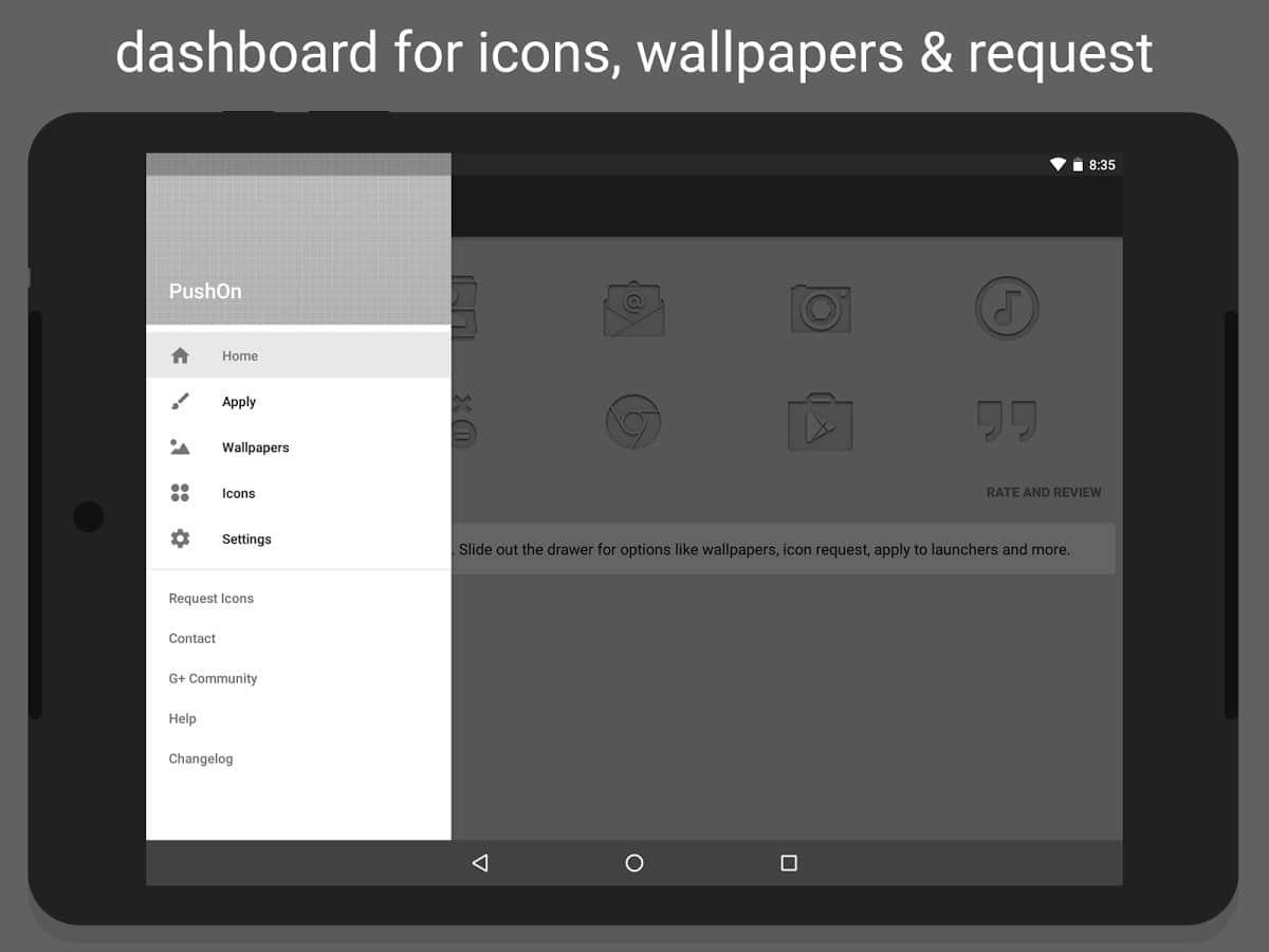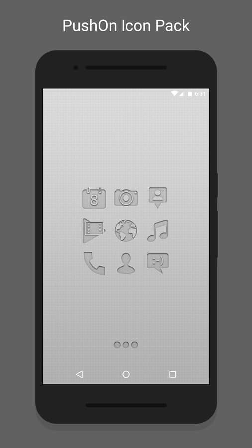 PushOn - Icon Pack - Хотите изменить свой рабочий стол? Тогда просто скачайте это приложение, которое содержит в себе не только набор красивых и весьма забавных иконок, но так же в дополнение к ним и обои, которые будут отлично подходить к иконкам. Стиль у иконок весьма необычный, у них нет цвета и они берут те цвета что есть на вашем экране, а порой вовсе выглядят так как будто их выдавили прямо в ваших обоях. Далеко не каждому понравится такое исполнение, однако если вы ярый фанат подобного минимализма, однозначно это для вас.