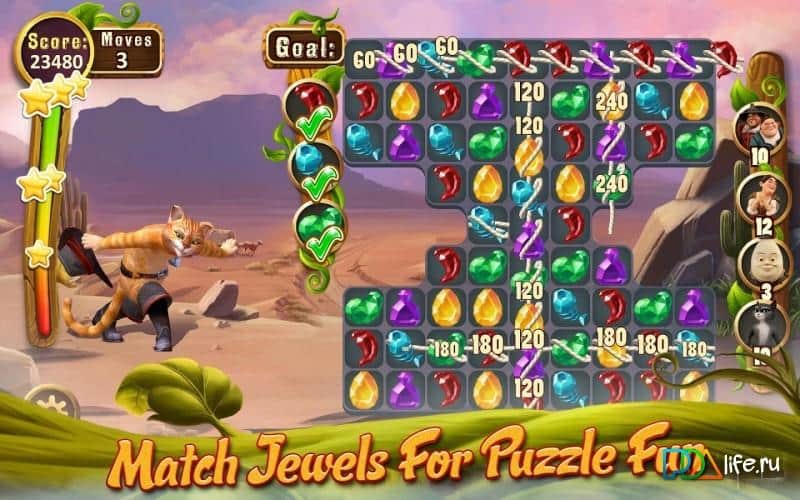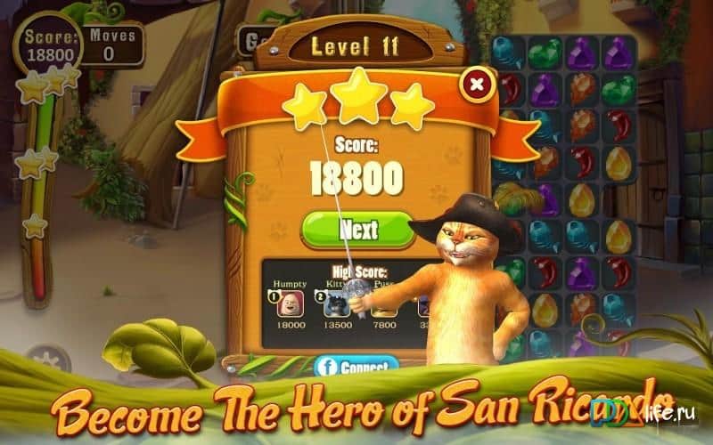 Puss In Boots Jewel Rush – Игра в жанре «три в ряд» с участием самого милого и отважного Кота в сапогах от DreamWorks Animation. Проходя уровень за уровнем, вам необходимо помочь Коту в сапогах добраться до злобного великана, который живет в большом замке в Сан Рикардо. В этом опасном и трудном путешествии вам помогут верные друзья Кота в сапогах - Шалтай Болтай, Джек, Джилл и Китти. В каждом уровне вам необходимо менять местами магические камни, чтобы набрать максимальное количество баллов, которые вы сможете обменять на восхитительные сюрпризы.