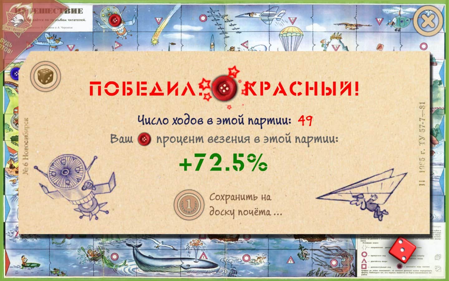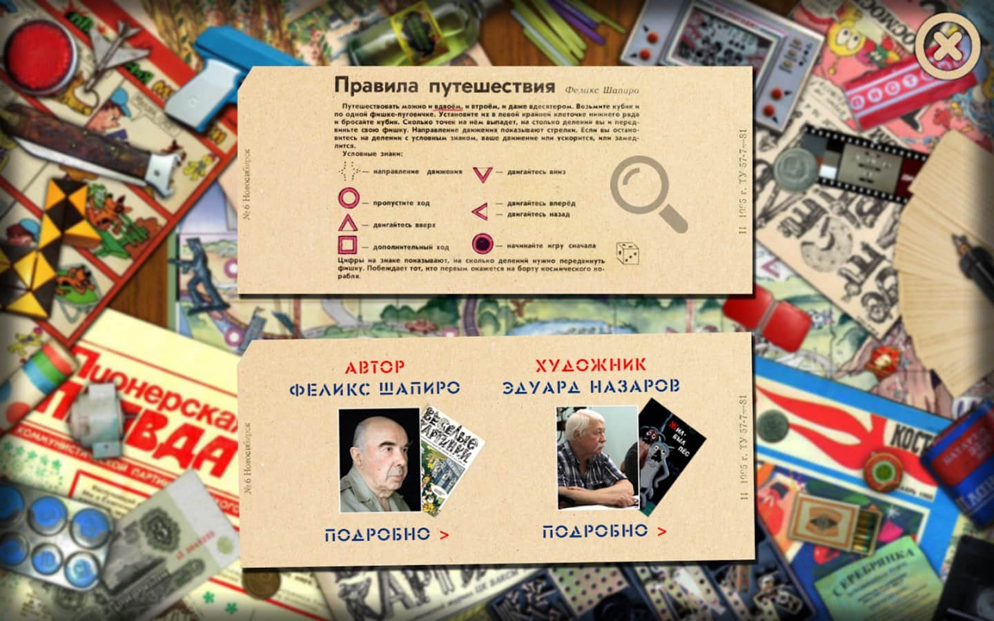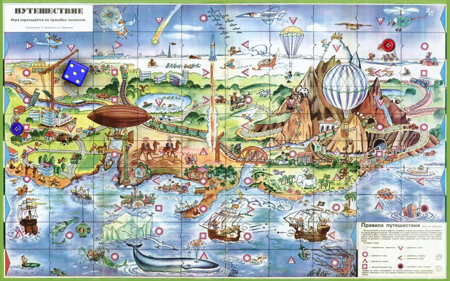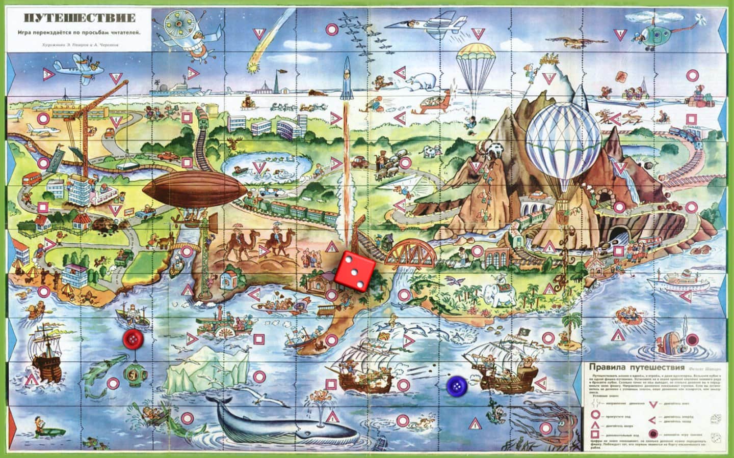 Путешествие в СССР - Эта игра была создана по настольной игре "Путешествие" которая периодически публиковалась в детском журнале «Веселые Картинки» в период с 1973 по 1985 год. Игра создана для детей с советского прошлого, чтобы не забыть и напомнить о веселых и не легких днях советских детей. А нынешним детям показать, как, и во что играли их родители и старшие братья, сестры. Все что вам нужно, так это пройти тест, на понимание советской жизни, а после, вам потребуется только удача, чтобы кинуть кубик с большим числом чем у вашего соперника :)