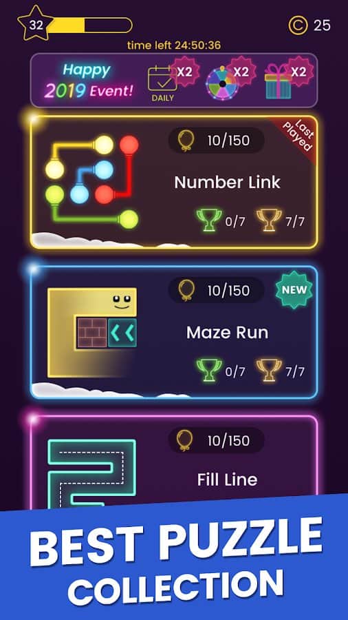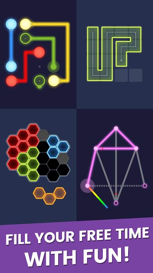 Puzzle Glow : Brain Puzzle Game Collection – увлекательная головоломка на андроид, которая собрала в себе множество знакомых вам задач. В этой игре вы будете составлять формы, линии, цвета и символы. Если вы любите решать многочисленные и разнообразные задачи, то эта игра создана для вас. Соединяйте одинаковые цвета на поле линиями так, чтобы они не пересекались между собой, расставляйте различные фигурки на поле, соединяйте фрагменты трубы воедино и рисуйте различные объекты. Играйте в эту игру в любое свободное время и набирайте очки, поднимаясь все выше в таблице лидеров.