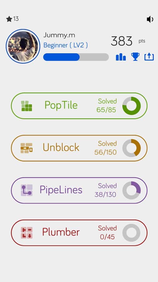 Puzzle King – увлекательная игра головоломка на андроид, состоящая из четырех мини игр. В этой игре вы будете выполнять различные задания в зависимости от выбранной вами игры: соединяйте одинаковые по цвету квадратики и убирайте их с поля, соединяйте разноцветные точки между собой при этом, не пересекая линии, соберите трубопровод из различных фрагментов находящихся на поле, вращая их между собой, а также проведите к выходу кубик, меняя местами его с другими блоками. Играйте в эту игру и тренируйте свою память, сообразительность и логику решая подчас непростые задачки. Игра порадует вас минималистичной графикой, простым и понятным управлением и возможностью соревноваться с друзьями.