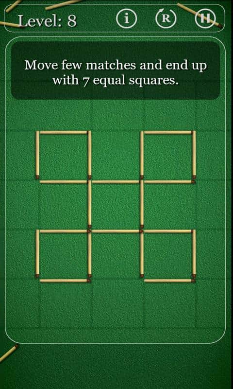 Puzzles with Matches - классные головоломки со спичками! Задача такая - перед вами фигуры, выложенная из спичек, ваша задача - переложить заданное количество спичек так, чтобы получилось новая фигура, необходимая по заданию. Спички можно передвигать, убирать, добавлять - в зависимости от поставленной задачи! Некоторые уровни имеют не один вариант решения! Ну а если совсем ступор - есть подсказка!