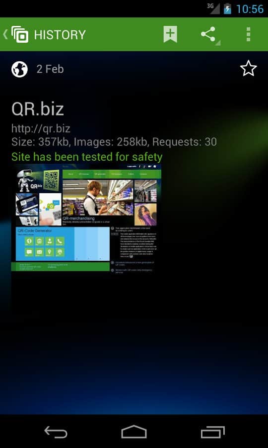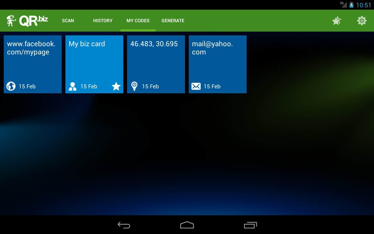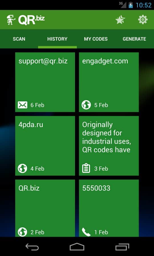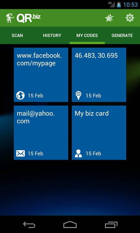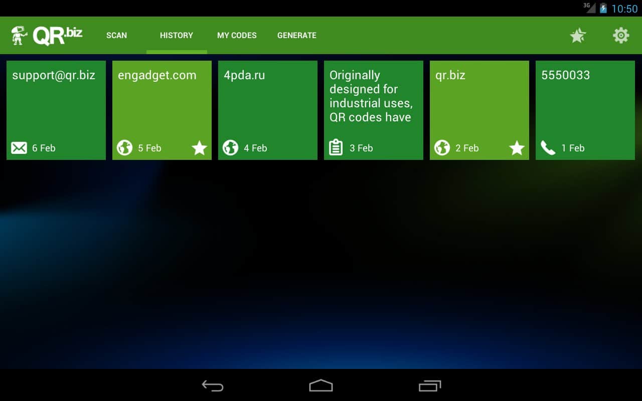 QR.BIZ сканер и генератор – два в одном для андроид устройств, простой и удобный сканер, а так же генератор QR-кодов. Создавайте QR-коды любых типов: тексты, ссылки, геометки, электронные письма, SMS или визитные карточки на свое усмотрение. А быстрый доступ к истории и простое управление, позволит быстро разобраться и понять, как работать с программой. Пользуйтесь!