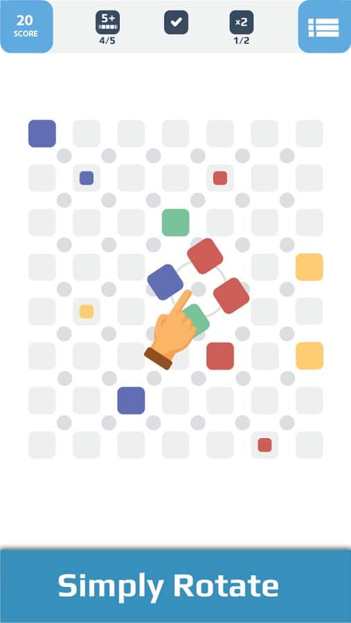 Quadro Puzzle – увлекательная головоломка на андроид, из жанра три в ряд. В этой игре вашей задачей будет вращать четыре соединенных между собой кубика вокруг своей оси. Составляйте ряды из пяти одинаковых по цвету кубиков в горизонтальные или вертикальные линии и убирайте их с поля. Блоки в хаотичном порядке будут появляться на экране вашего телефона или планшета, так что приготовьтесь к динамичной игре, не давая блокам заполнить весь ваш экран. Как только вы сформируете линию из пяти кубиков, она исчезнет, освободив немного пространства. Прилагайте все свои логические навыки и мышление, чтобы вращать кубики и составлять ряды из них. Игра порадует вам минималистичной графикой и простым управлением.