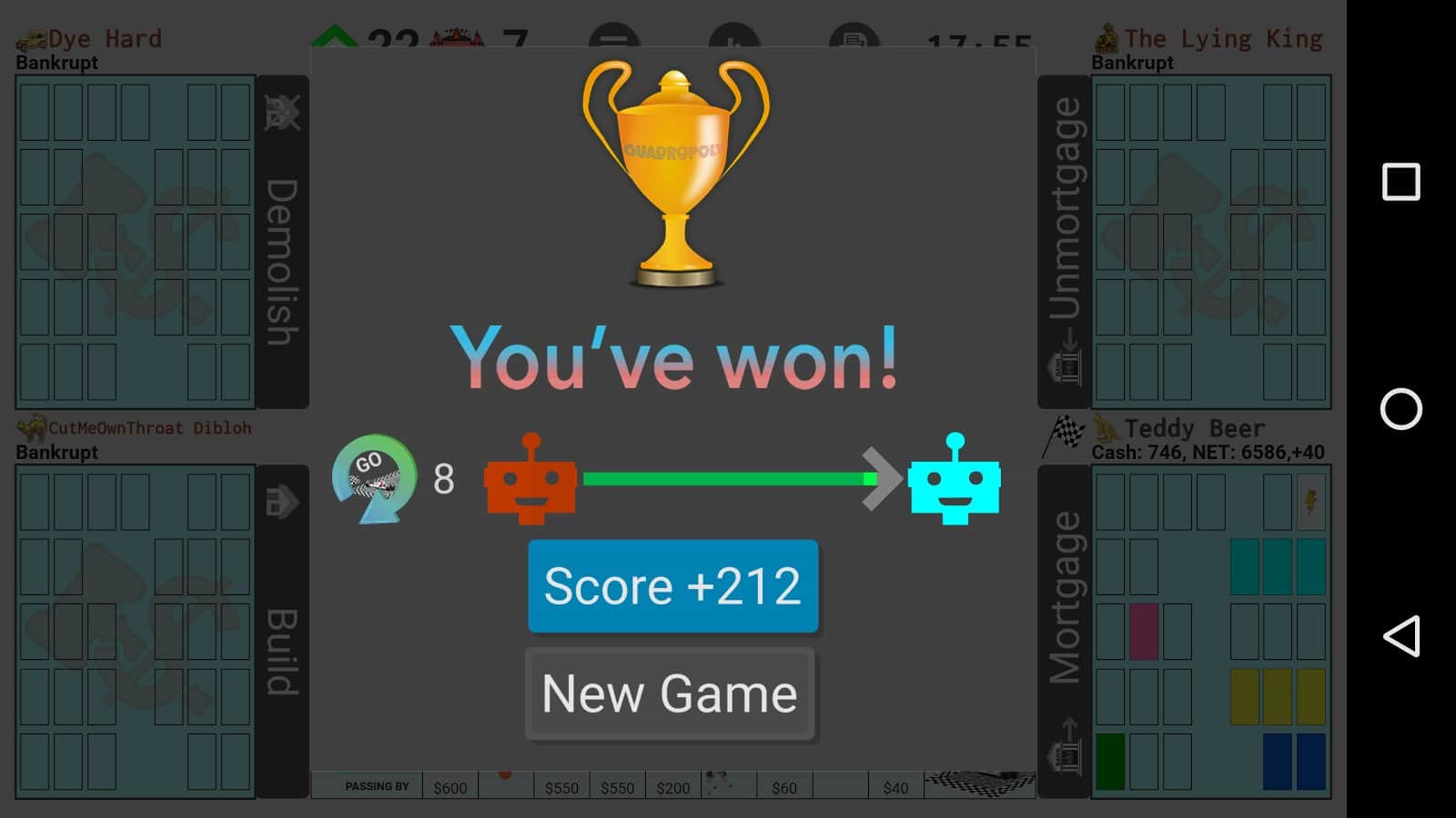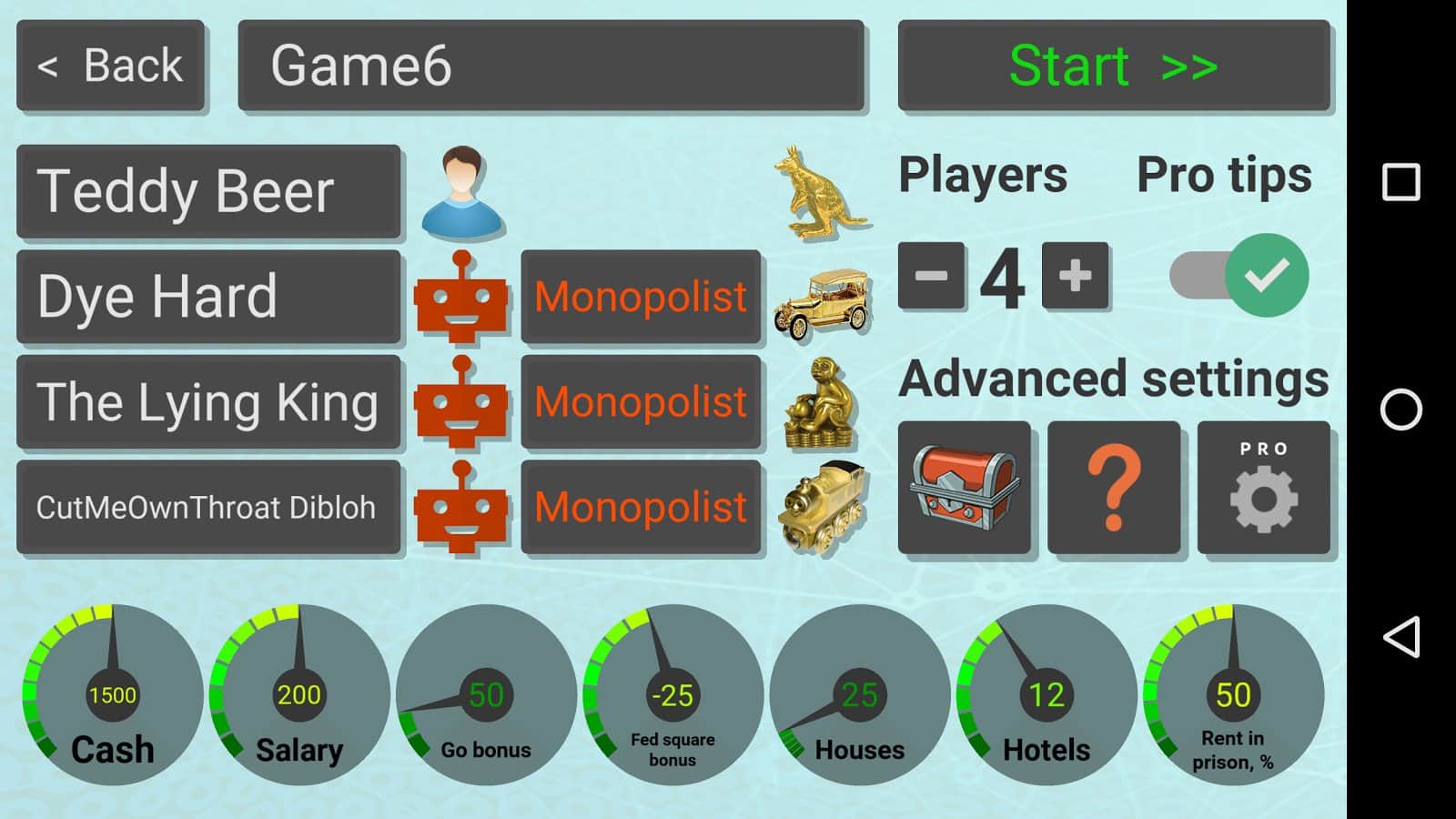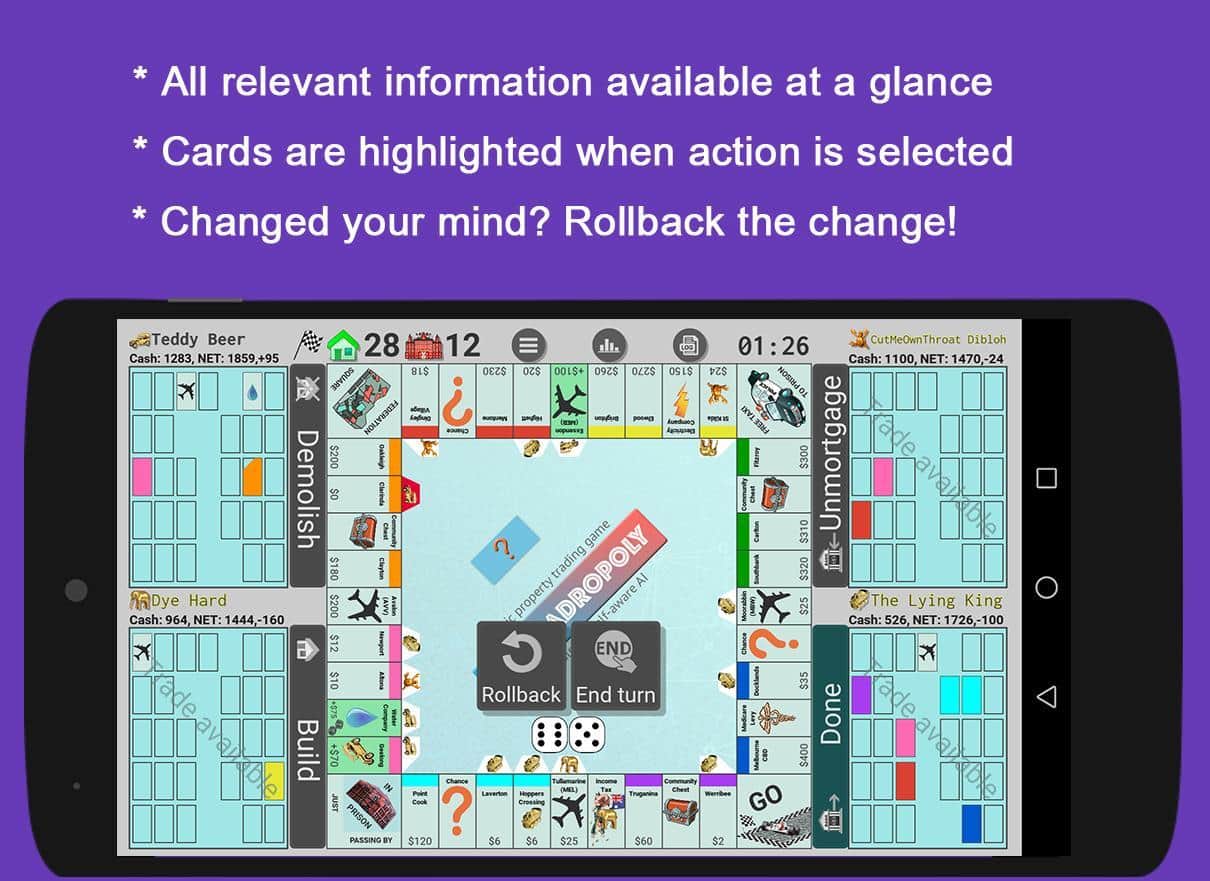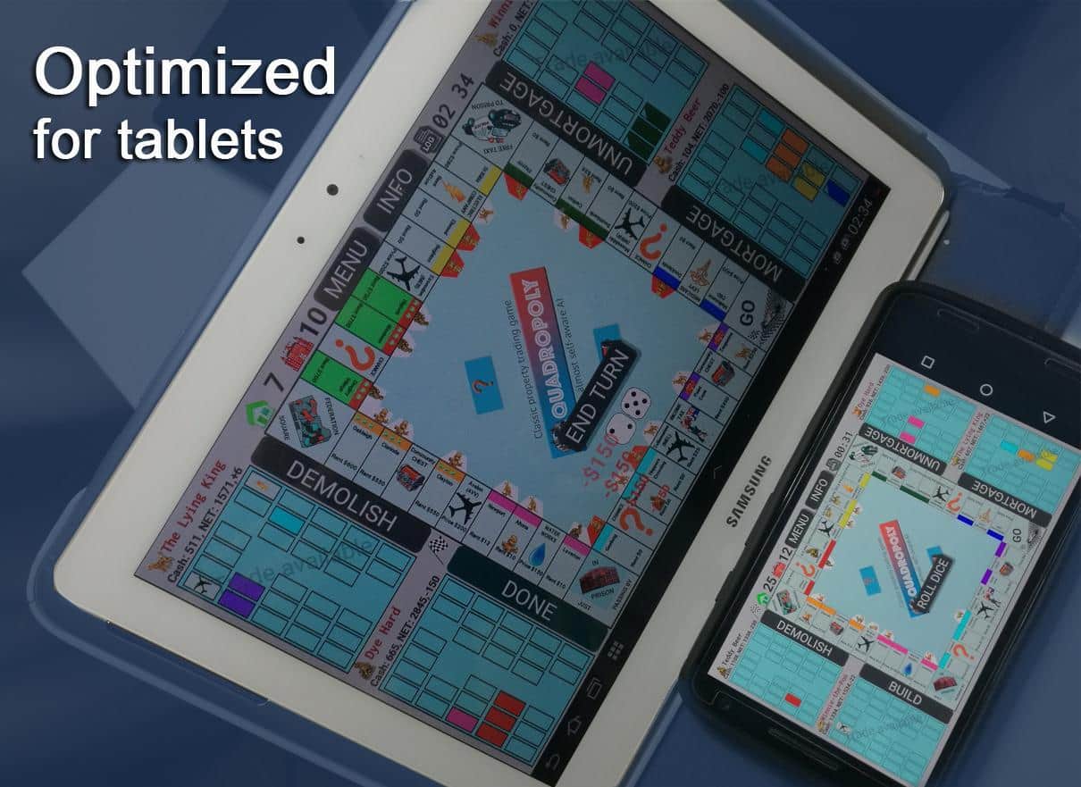 Quadropoly Pro – популярная настольная игра на андроид, где вы будете играть в монополию. В этой игре вашей задачей будет скупать недвижимость за небольшие деньги и вести переговоры с другими бизнесменами. Улучшайте свои навыки игры и станьте лучшим игроком соревнуясь с опытным AI. В игре представлено несколько режимов сложности подбирайте подходящий вам и добивайтесь отличных результатов играя в монополию. Также игра порадует вас широким набором настроек, где вы сможете пройти обучение и слушать полезные советы при покупке недвижимости. Каждый АI в этой игре имеет свою собственную индивидуальность, которая определяется отношением к риску и собственности.