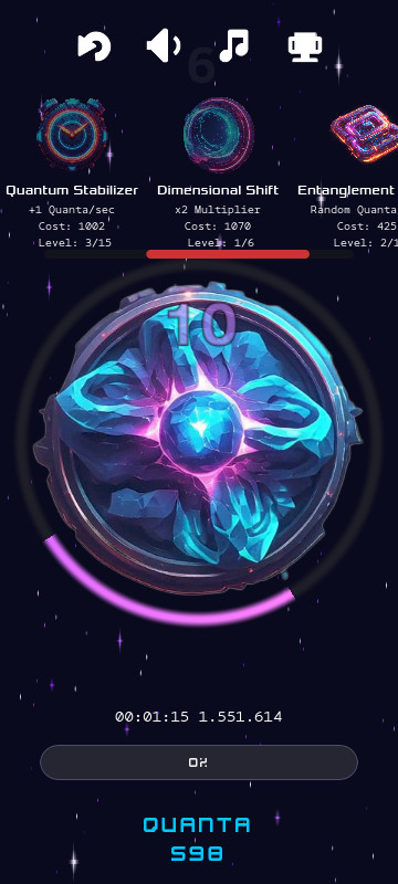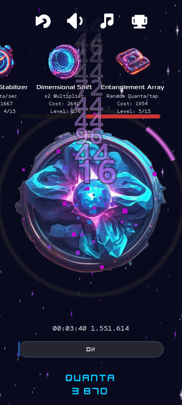 Погрузись в мир квантовой энергии с Quantum Tap — футуристическим кликером, где каждый каскад энергии открывает новые уровни могущества. Генерируй Кванты, улучшай технологии и управляй нестабильной энергией, чтобы достичь квантовой сингулярности. Развивай ускорители частиц, стабилизаторы и измерительные сдвиги, наблюдая, как визуальные эффекты и ритмичный саундтрек превращают нажатия в гипнотическое путешествие сквозь науку и мощь.