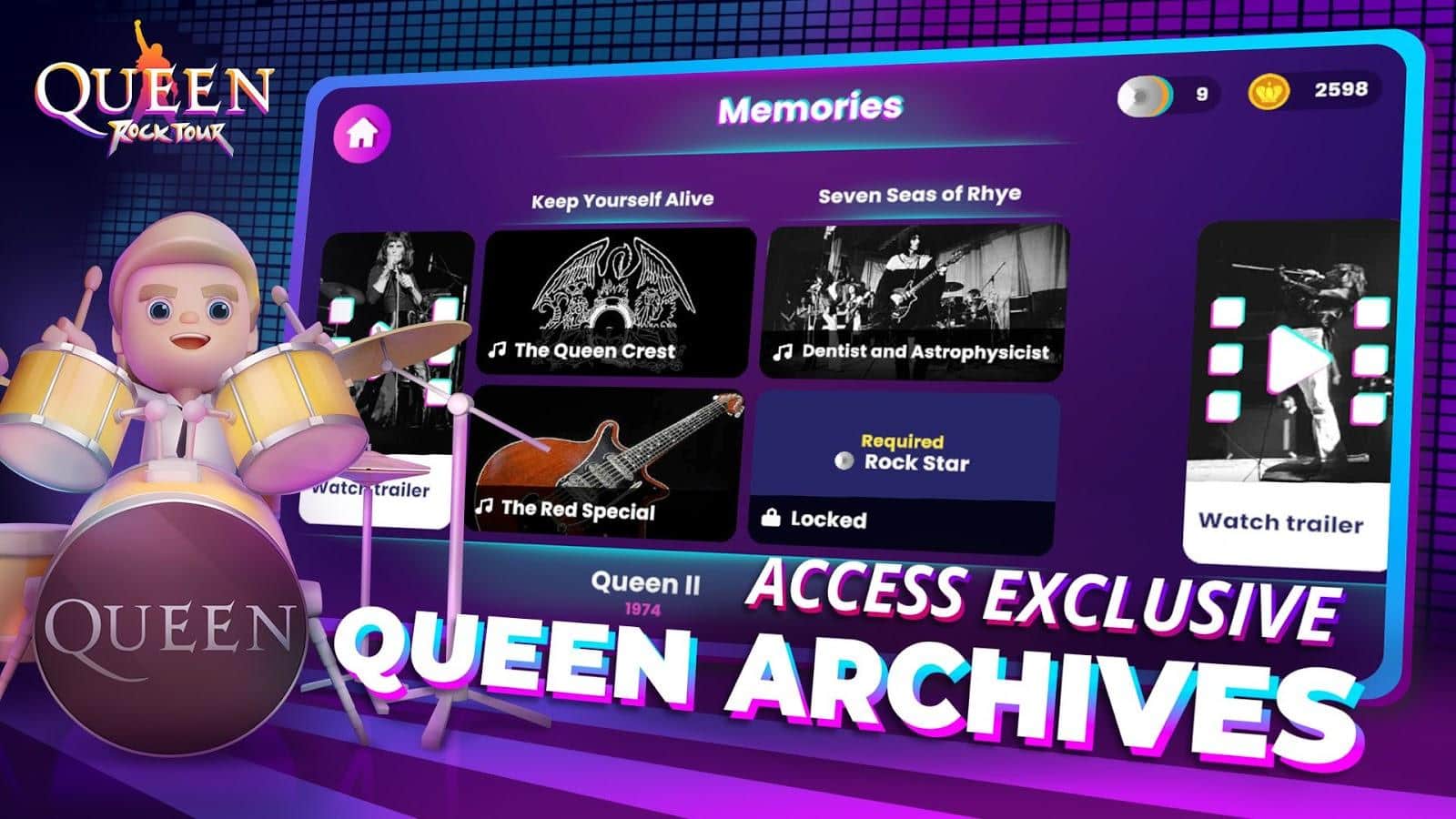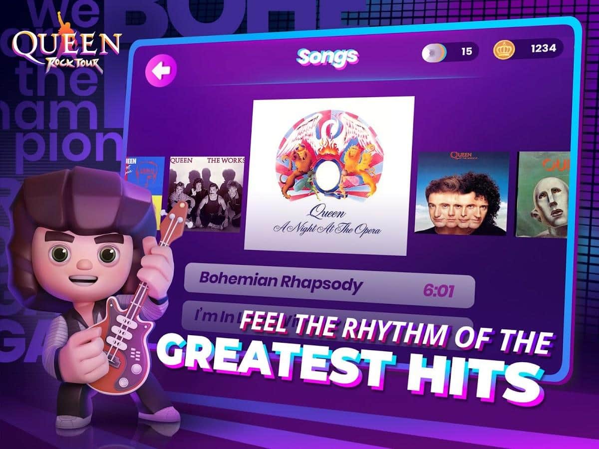 Песни легенд рока, группы Queen, всегда будут актуальны! Пройдите вместе с ними их путь и исполните более 20 фантастических песен, просто нажимая на плитки. Они издают определенные звуки с песни, поэтому старайтесь не пропускать их, чтобы не была полная каша. Вас ждет не просто наслаждение ритмами, но и эксклюзивные снимки группы, интересные факты и виртуальные повторы выступлений. Множество инструментов, тематические наряды, локации в разных местах, путешествие в прошлое, архивы и прочие возможности.