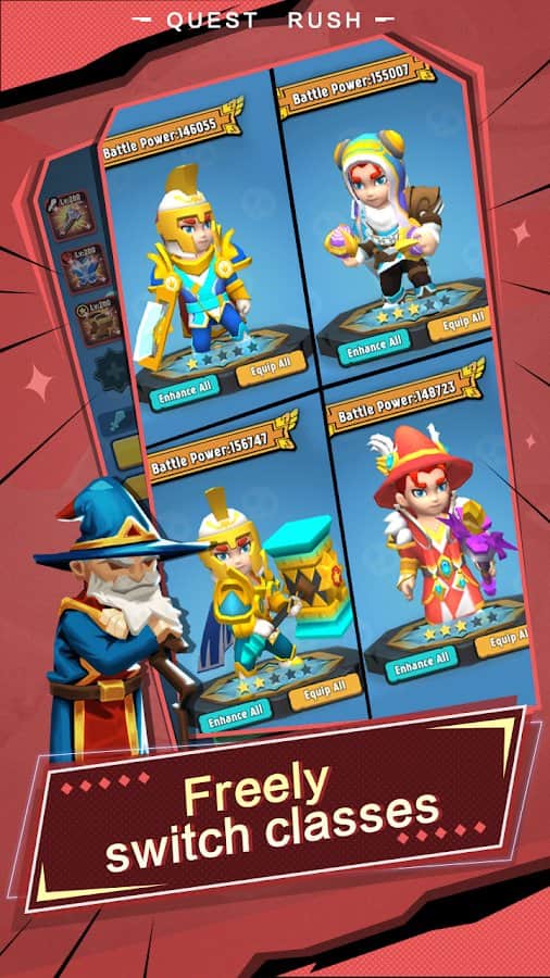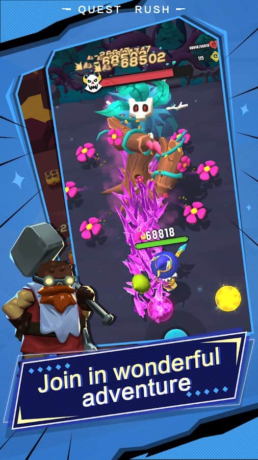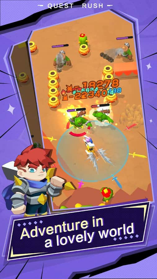 Готовы к интересным приключениям в удивительном 3D мире Quest Rush? Тогда приготовьтесь, будет жарко и весело! Вас ждут бои с разными видами врагов, больше или сильнее в несколько раз. Получайте новые уровни, пробуйте больше 100 карточных стратегий, используйте светлую или темную магию, наденьте устойчивую броню или красивые костюмы, выбирайте любимые мечи из широкого выбора оружия и прочее. Скучно точно не будет, игра подкинет неожиданные сюрпризы и разные локации, которые нужно будет исследовать.