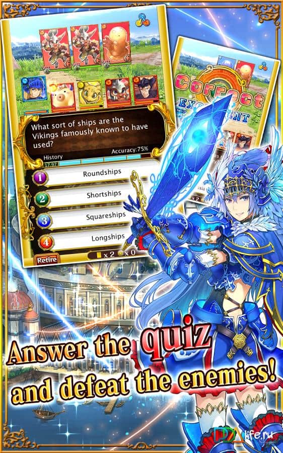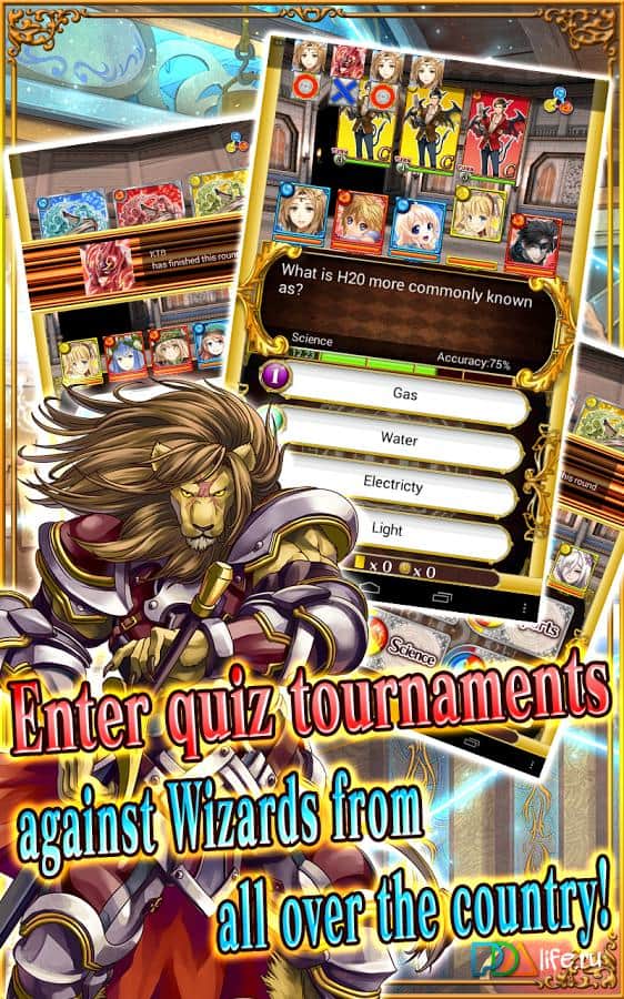 Quiz RPG: World of Mystic Wiz – карточная коллекционная игра популярная в Японии. Отвечайте на различные вопросы, зарабатывайте карты и сражайтесь со злыми силами. Вся игра, построенная на правильных ответах на поставленные вопросы с различных тематик (наука, развлечения, история, спорт и география). Также в игре есть возможность усовершенствования ваших карт.