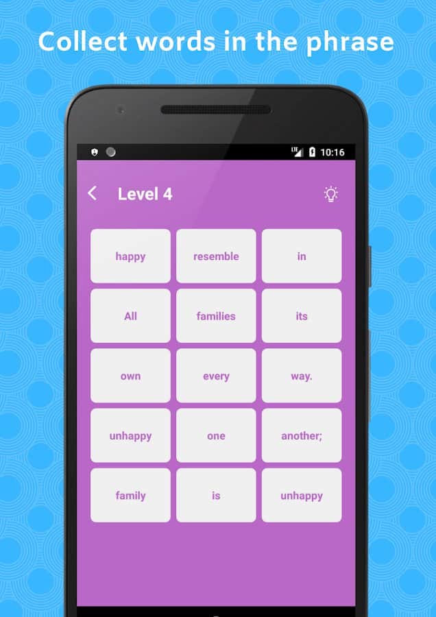 Quote Mosaic: puzzle words and find the citation – интересная головоломка на андроид, где вам предстоит составлять слова в правильном порядке и получать по итогу цитаты и фразы. В этой игре вы найдете большое количество фраз цитат популярных и известных людей таких как: Цицерон, Конфуций, Фридрих Ницше и Иммануил Кант и другие которые поменяли мировоззрение людей своими высказываниями. В игре вы найдете мотивирующие, смешные, грустные, добрые, мудрые и вдохновляющие фразы, которые позволят вам тренировать память и смекалку.