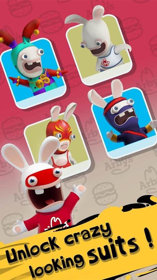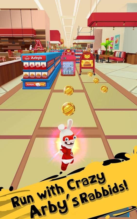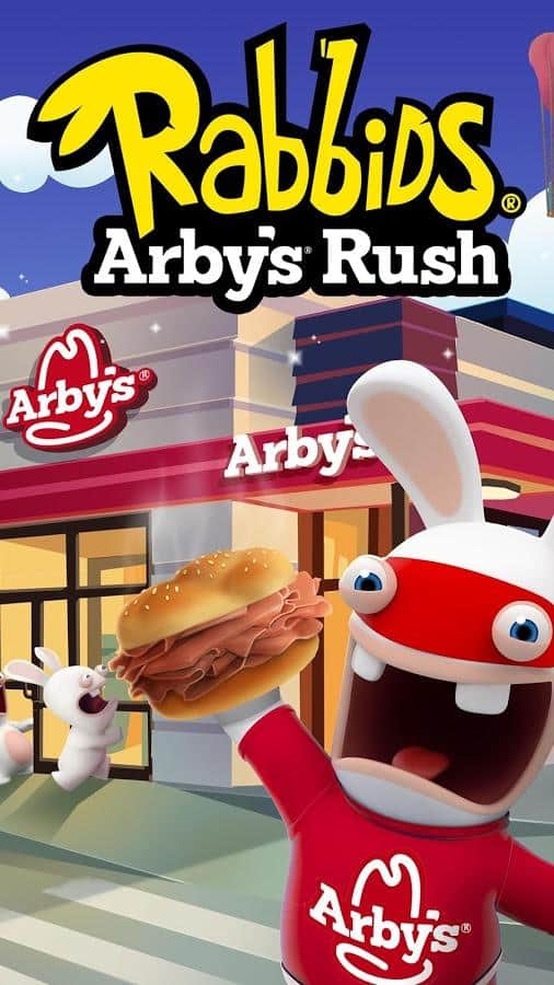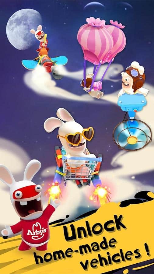 Rabbids Arby's Rush – раннер на андроид, где вы будете управлять безумными кроликами от Ubisoft Entertainment, который хотят отправиться на Луну. Наши кролики не покидает мысль о Луне и теперь они нашли другой способ на нее отправится. Бегайте, ездите, скользите и летайте на различных транспортных средствах и открывайте для себя разнообразные костюмы. По пути собирайте монетки и ростбиф, который поможет получить нужный вам газ и для питания ракеты. Пройдите все испытания и станьте первым среди друзей, кто достигнет Луны.