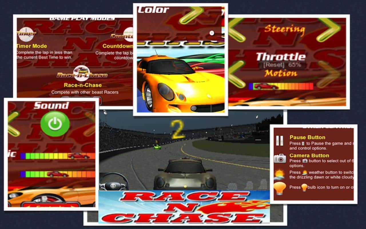 Race n Chase - 3D Car Racing ну что ж - самое время погонять на болидах в режиме гонки на андроид! Вас ждут трехмерные гонки с неплохим управлением. Выбирайте авто, цвет, который вам по душе - и вперед! К победе! Для максимального эффекта от прохождения трассы используйте 6 режимов вида камеры! Несомненно, главной фишкой игры является смена погодных условий - солнце сменяет дождь и т.д.