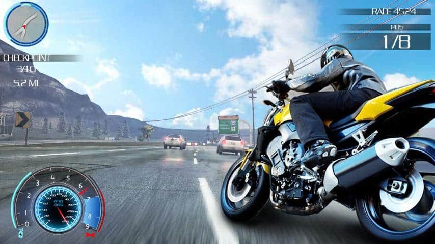 Racing Moto 3D – гоночная игра на андроид, где вы будете управлять мотоциклом и гонять по улицам и оживленным трассам. Возьмите под свой контроль мотоцикл и проведите его по различным трассам с оживленным трафиком. Неситесь вперед на огромной скорости и обгоняйте впереди едущие машины и обходите преграды на пути. Идите на риск и обгоняйте машины, прижимаясь к ним как можно ближе - за это вы будете получать дополнительные очки и море адреналина. Игра вас порадует простым и плавным управлением, а также бесконечным режимом игры.